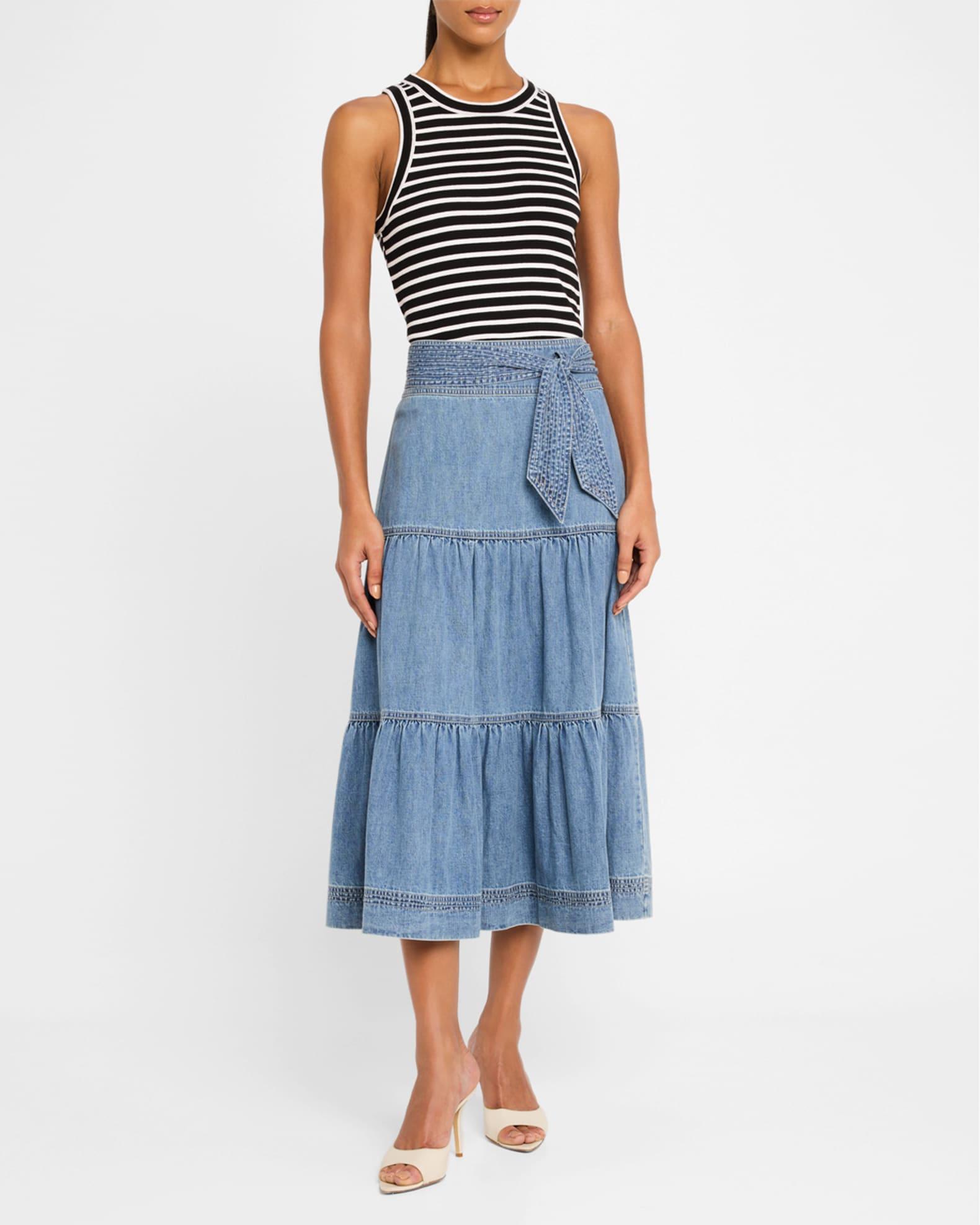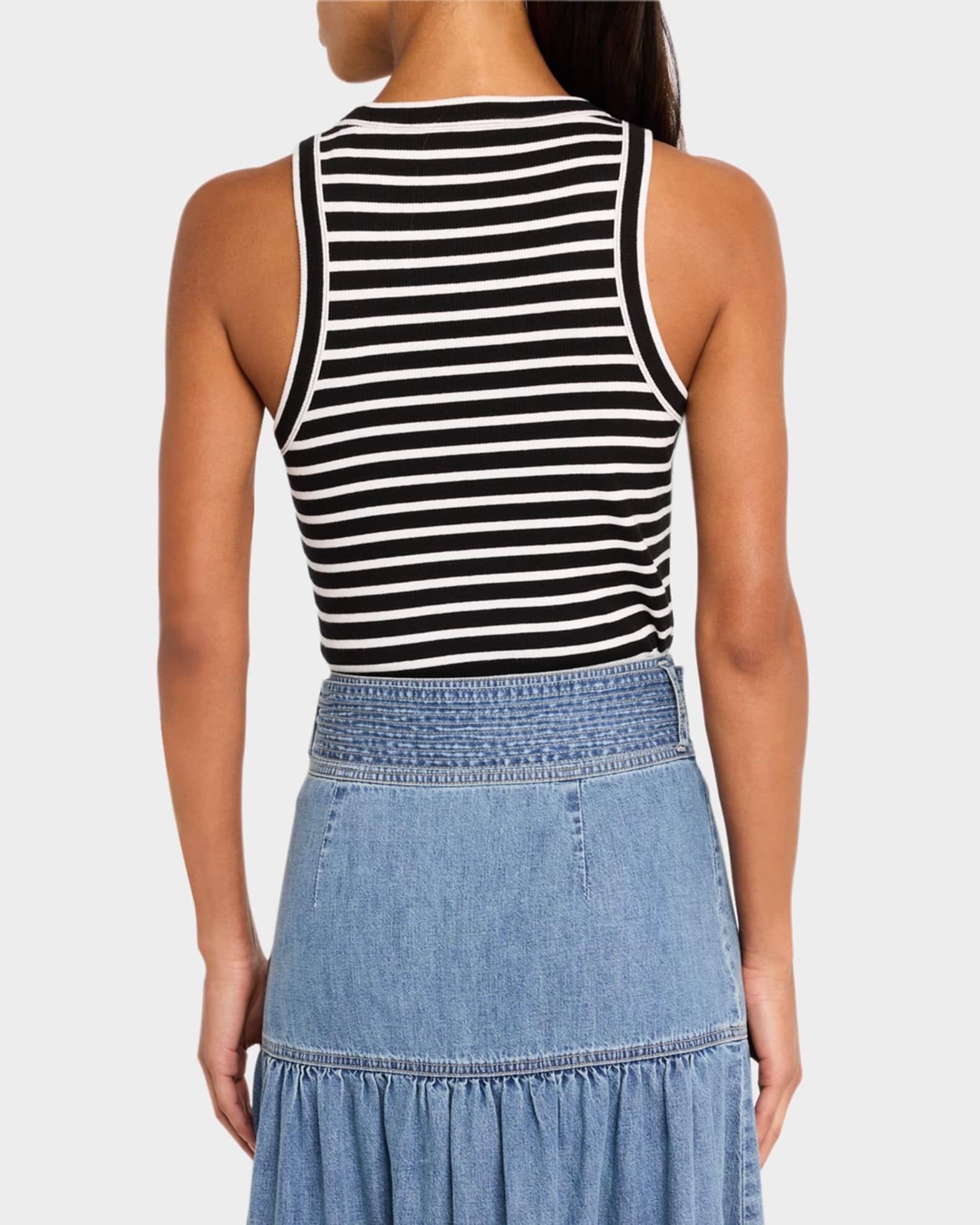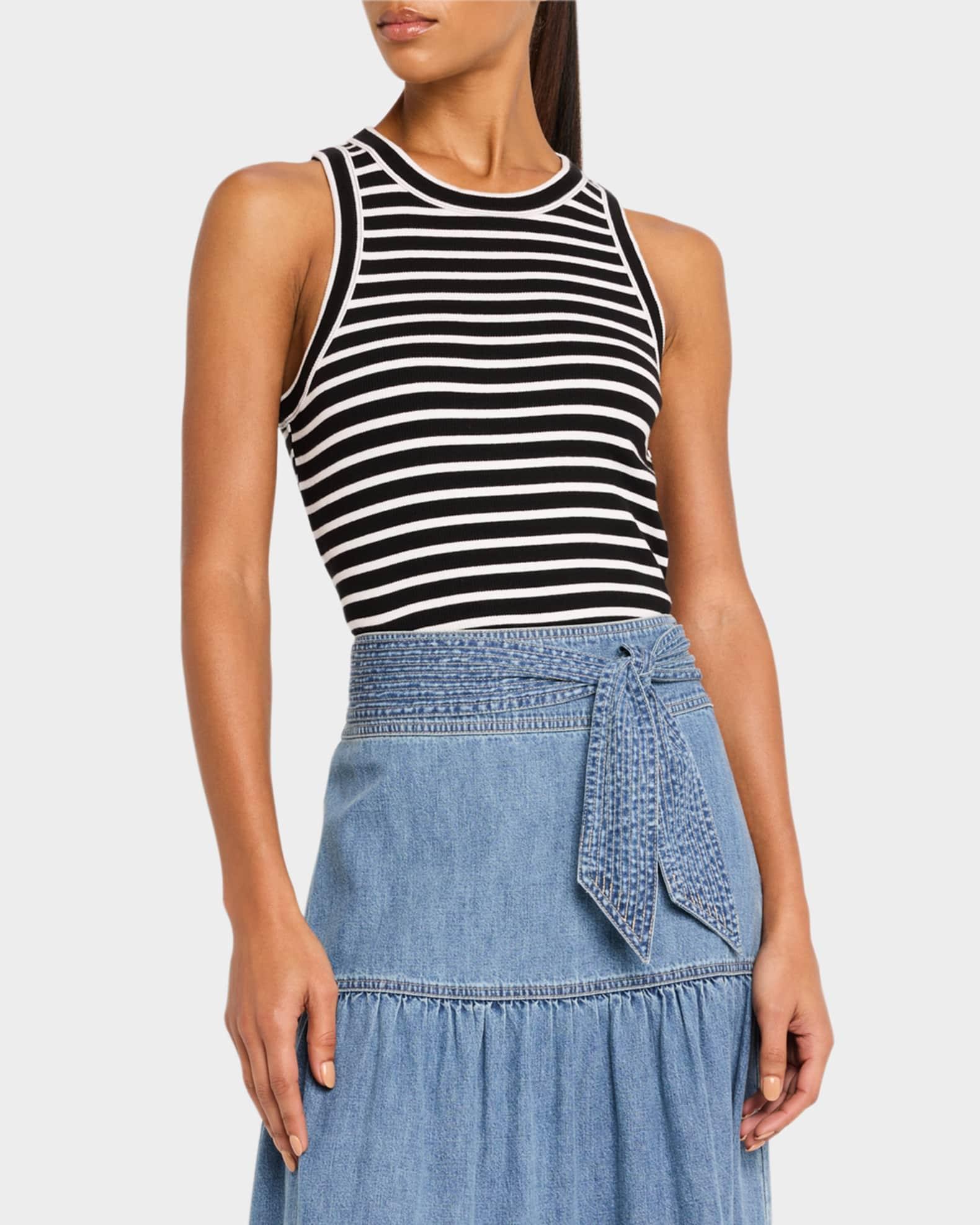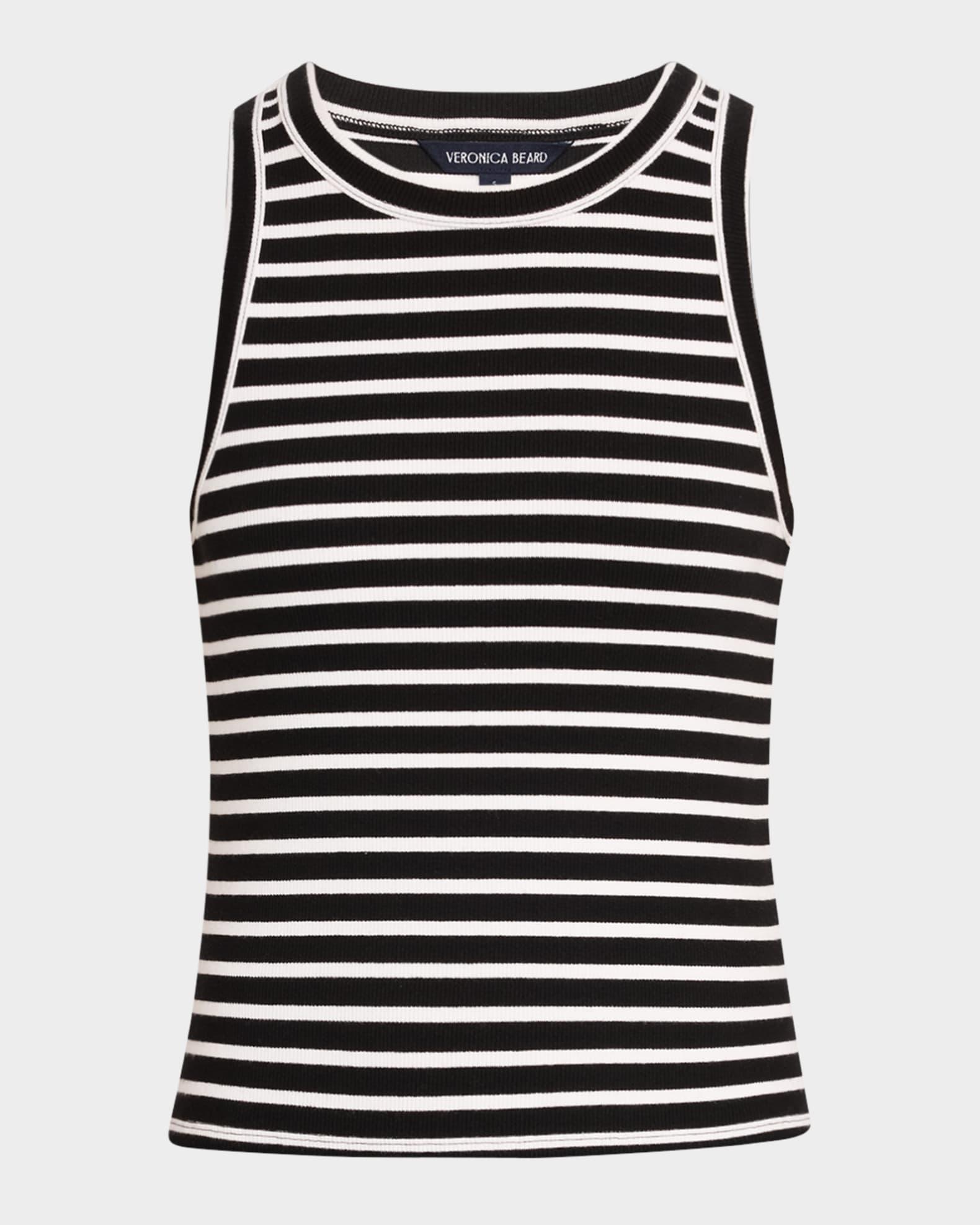 Veronica Beard "Jordyn" stripe ribbed-knit tank top Crew neckline Sleeveless Cropped fit Hem sits at the hip Pullover style Cotton/elastane Machine wash cold Made in Peru