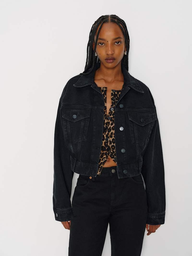 Layer up. Shop the Jori Cropped Denim Jacket from Reformation, a cropped button front shirt jacket. It features a collared neckline and patch pockets.