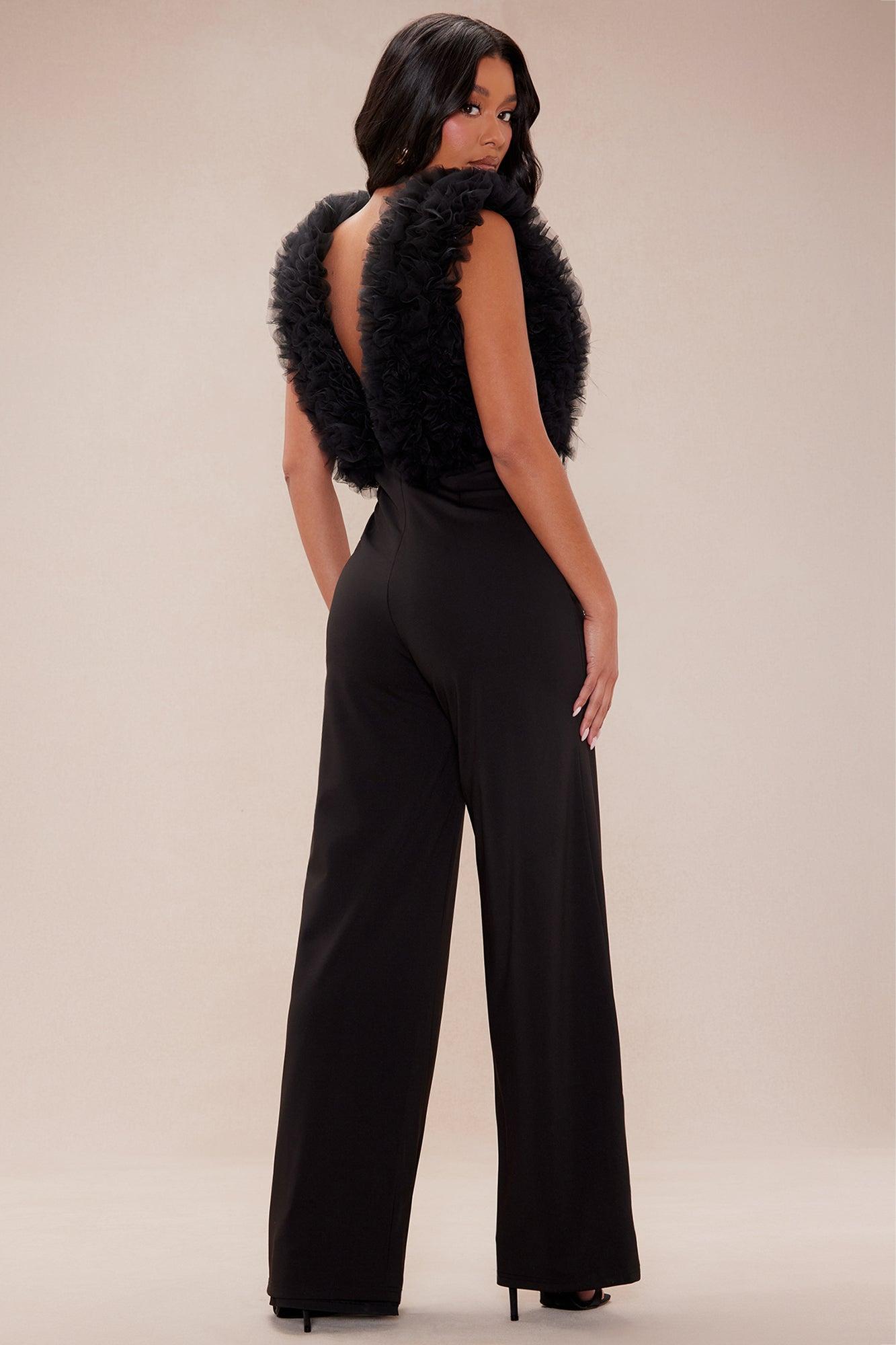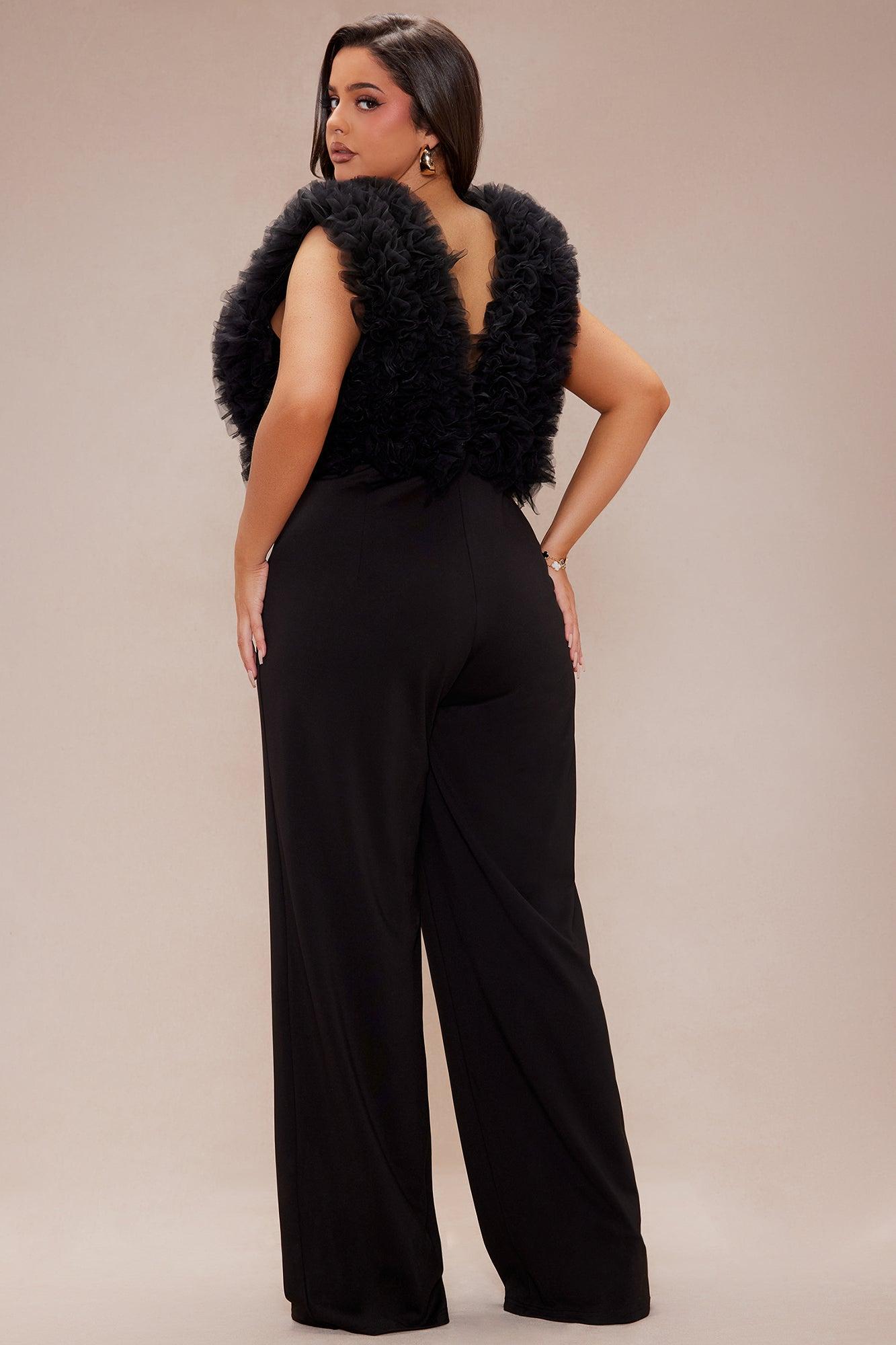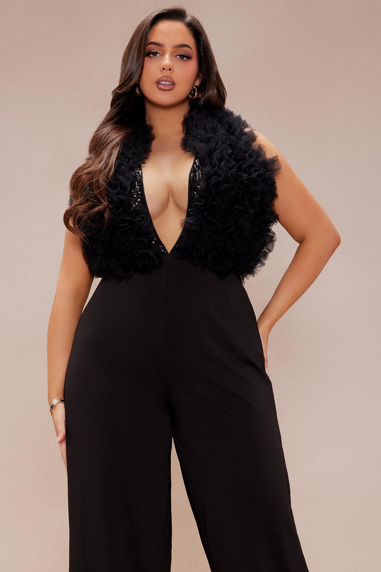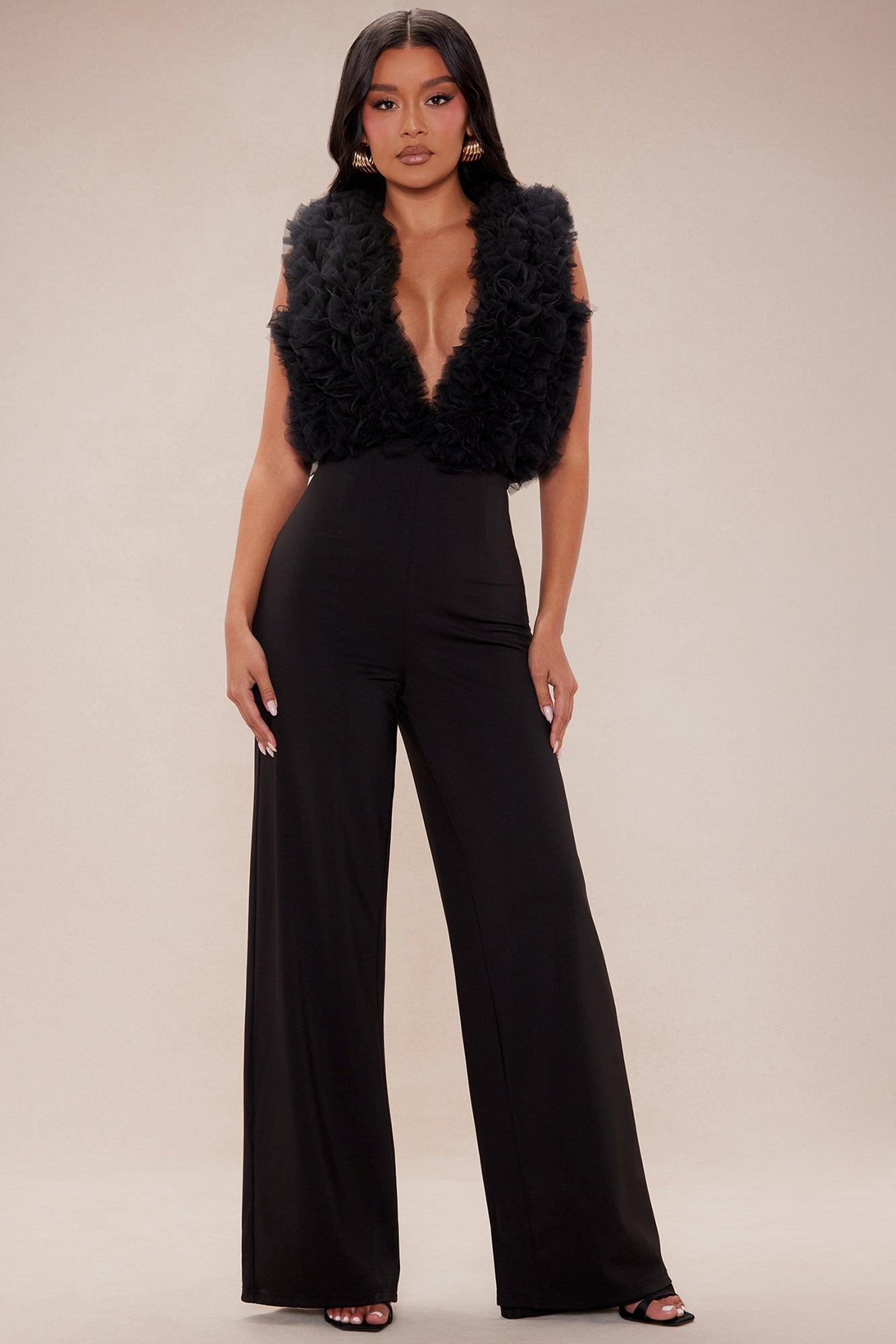 Available In Black. Wide Leg Jumpsuit Deep V-Neck Sleeveless Ruffle Detail Back Zipper Closure Sequin Stretch Shell 1: 100% Polyester Shell 2: 95% Polyester 5% Spandex Lining 1: 100% Polyester Lining 2: 100% Polyester Lining 3: 100% Nylon/ Polyamide Imported
