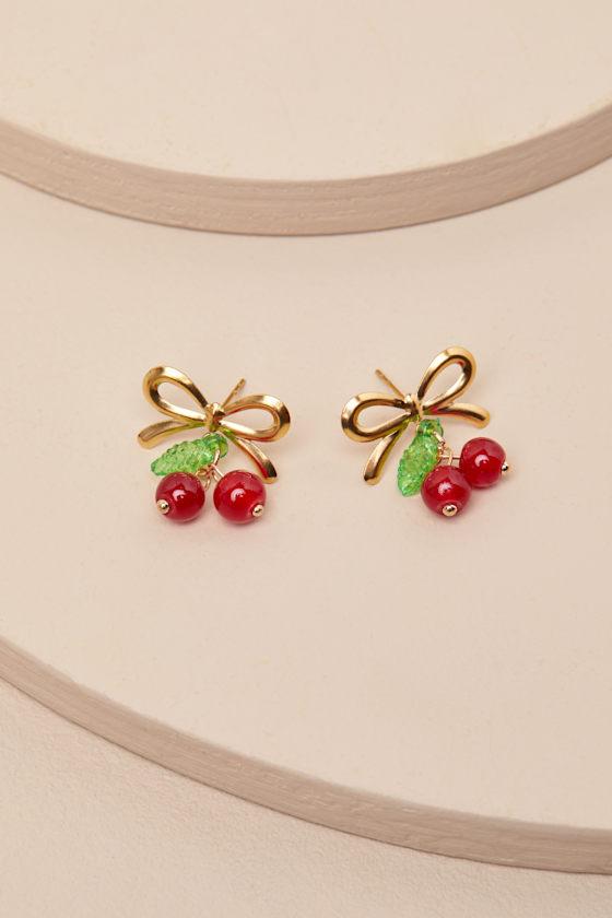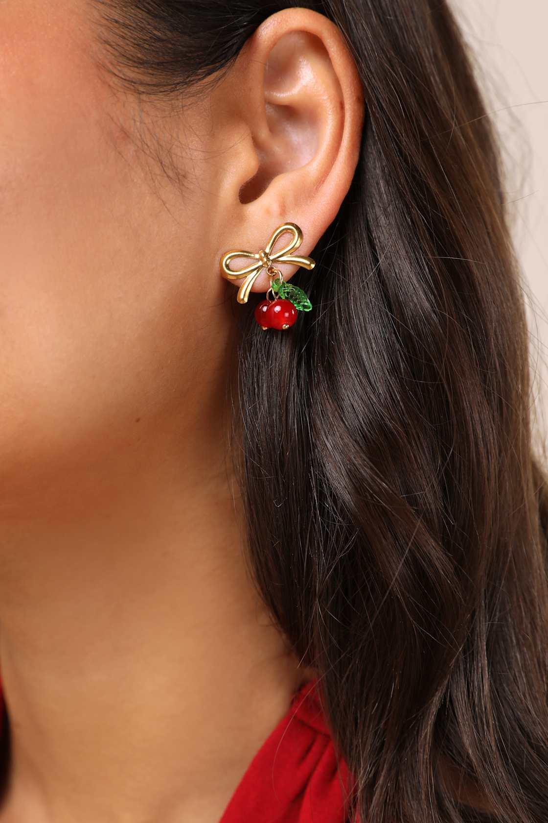 Darling outfits require dainty accessories like these gold-toned stud earrings that effortlessly enhance your sweetheart energy. Dainty bow-shaped posts support dangly, cherry-like beaded charms that offer a bit more whimsy to the cutesy design.