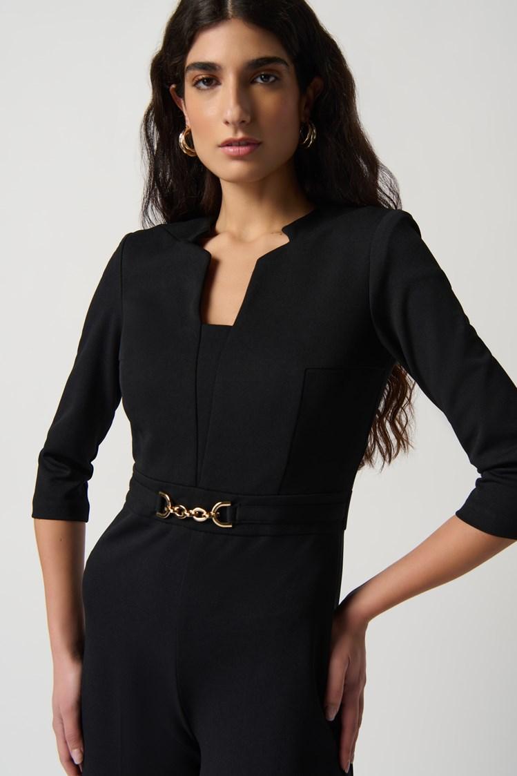 A waist chain ornament and three-quarter sleeves lend stunning dimension to this refined wide-leg jumpsuit. While the V-neck adds a feminine touch to this garment, the scuba crepe fabric delivers lightweight comfort. Its wide-leg silhouette provides comfortable mobility, while the back zipper opening offers easy wearability. Cold water wash