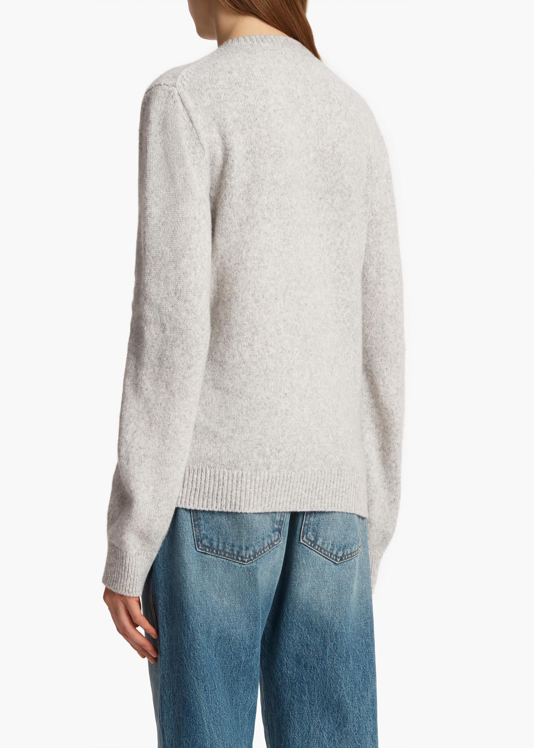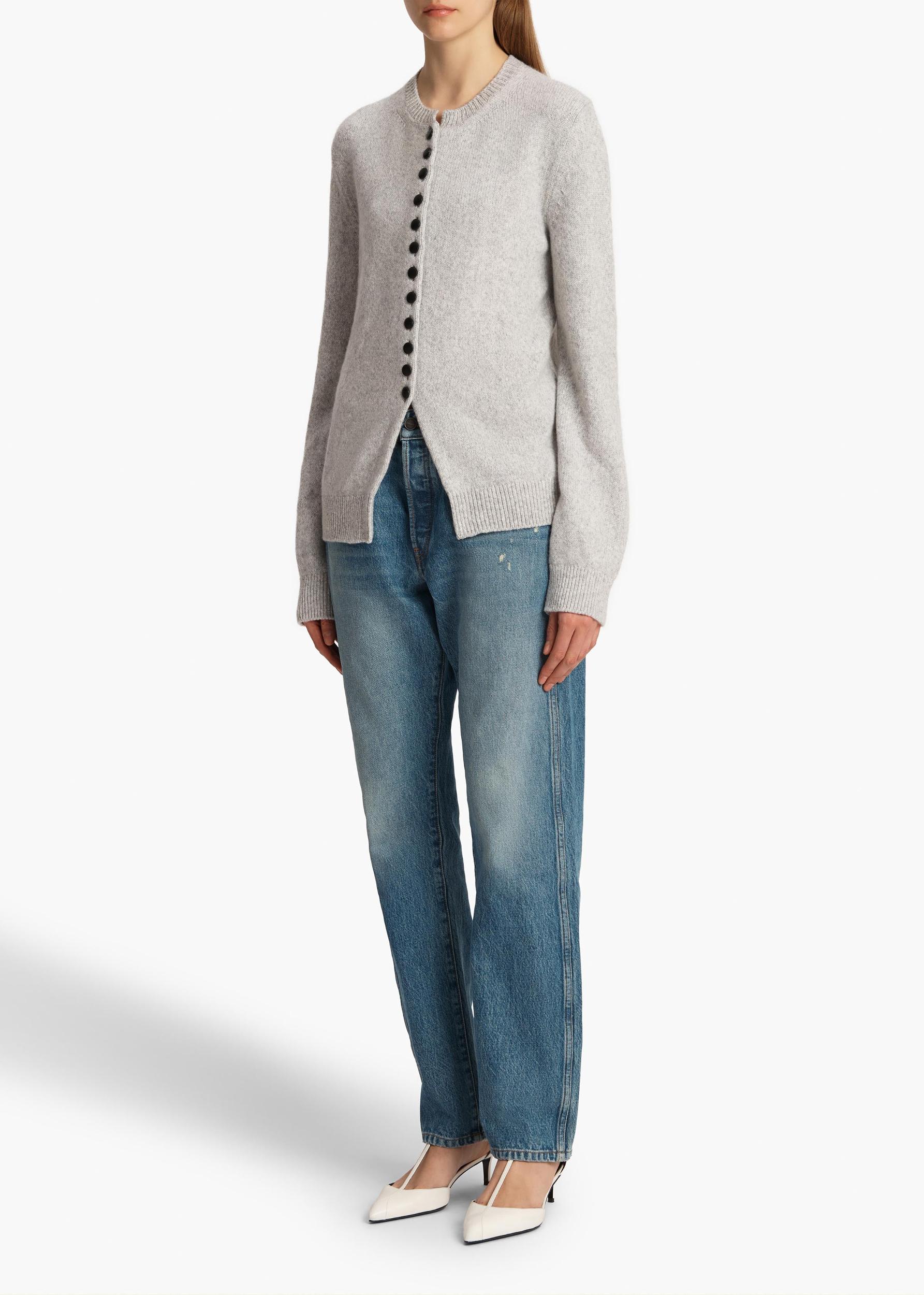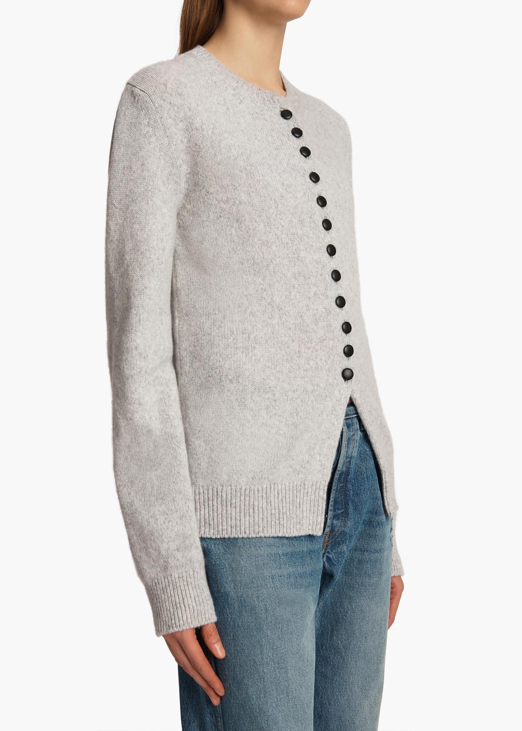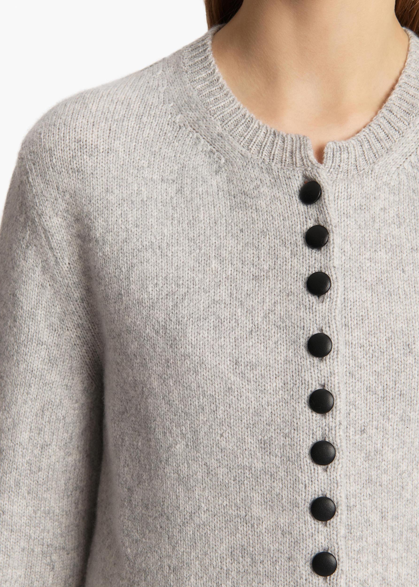 A split-hem cardigan in dense cashmere selected for its bouncy and substantial character. Traced by leather buttons. With ribbing at crewneck, cuffs, and hem.