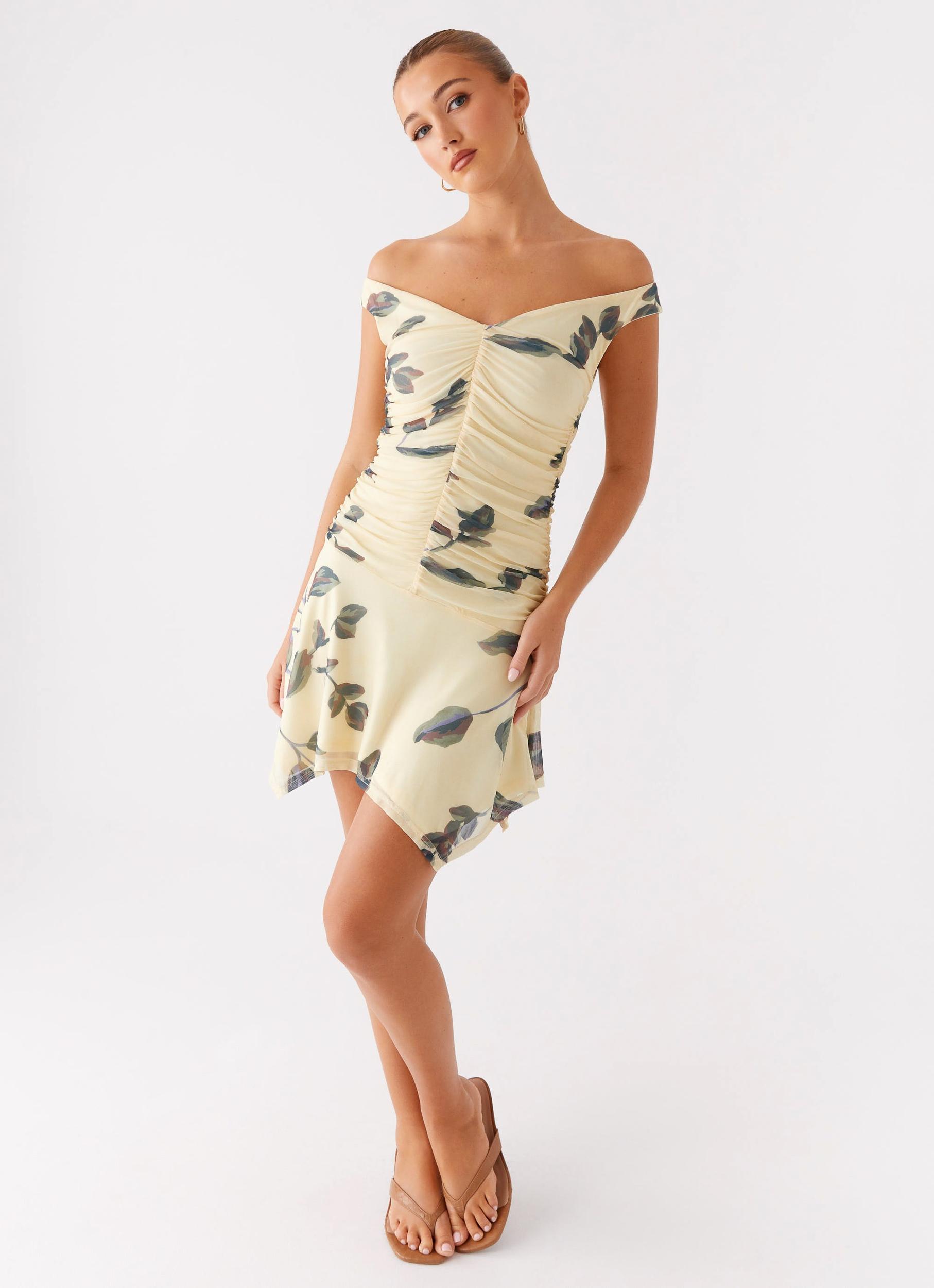 Peppermayo Exclusive The Josette Mini Dress features a romantic off-the-shoulder neckline and a figure-hugging silhouette in soft stretch mesh. Fully lined for comfort, this mini length piece is your go-to for a flattering, feminine look. - Mini length- Off the shoulder neckline- Stretch mesh fabric- Fully lined- Gripper tape along inner neckline- Peppermayo exclusive print- Print may differ per garment- Fabric: 87% Polyester, 13% Spandex Size AU 8 / US 4 garment measurements: Bust: 70 cm / 27.56 inWaist: 64 cm / 25.20 inHip: 82 cm / 32.28 inLength: 61.5 cm / 24.21 in Yasmin is 174cm and wearing a size AU 6 / and US 2