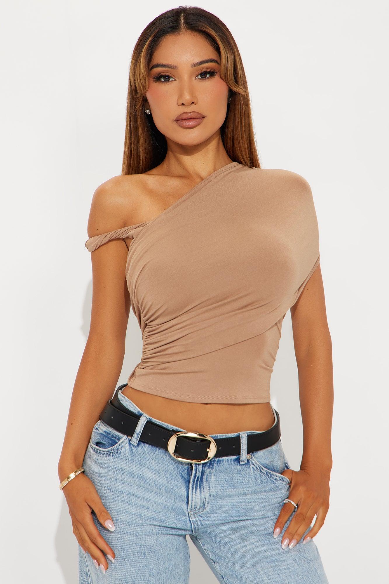 Available In Red And Taupe. Top Twist Strap Ruched Seaming Stretch 95% Rayon 5% Spandex Imported