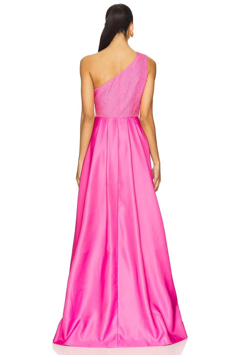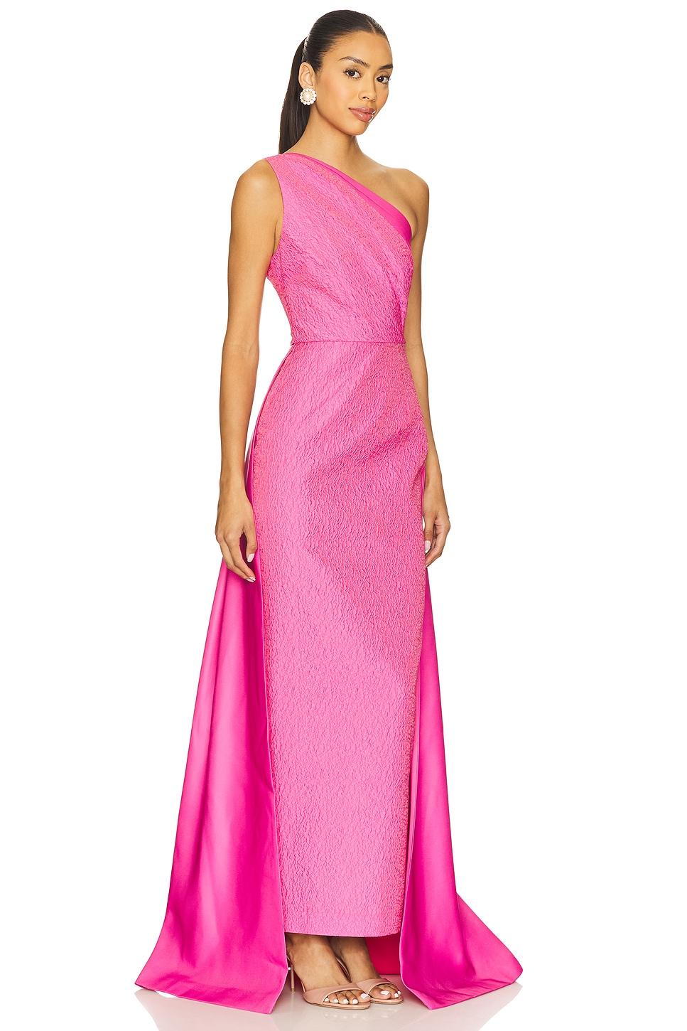 Self: 100% polyesterLining: 97% polyester, 3% spandex. Hand wash cold. Fully lined. Hidden side zip closure. Layered draped skirt at back. One shoulder styling. Midweight jacquard fabric. Made in Chile. Revolve Style No. SLEE-WD416. Manufacturer Style No. P25D24.
