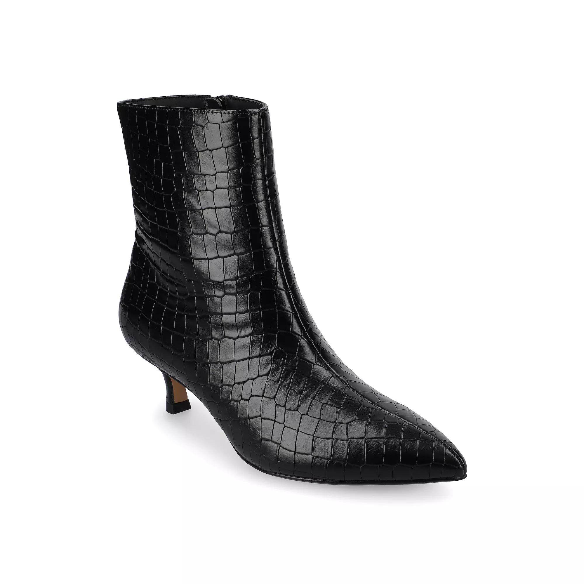 The pointed-toe bootie that gets straight to the point: you look incredible. Arely brings that sleek sophistication you've been searching for, with a kitten heel that means business and an inside zipper that's pure genius.Soft faux leather wraps around our 4mm Journee Comfort System insole because sharp style shouldn't come with sharp pain. This is comfort as your superpower — the kind that carries you from that big presentation to dinner plans without missing a beat.Whether you're commanding the conference room or catching up with your crew, Arely keeps you grounded in comfort and elevated in style. Because the best accessory? Confidence that doesn't hurt your feet. Click this FOOTWEAR GUIDE to find the perfect fit and more! - https://www.kohls.com/feature/shoesizeguide.jsp. SHOE FEATURES: footbed, Side zipper for easy on and off, Kitten heel. SHOE CONSTRUCTION: Faux-leather upper, Fabric lining, Polyurethane outsole. SHOE DETAILS: Pointed toe, Zipper closure, 2-in. heel, 6-in. shaft height, 11-in. circumference, footbed, Spot clean, Imported. Color: Croco Black. Gender: female. Age Group: adult.