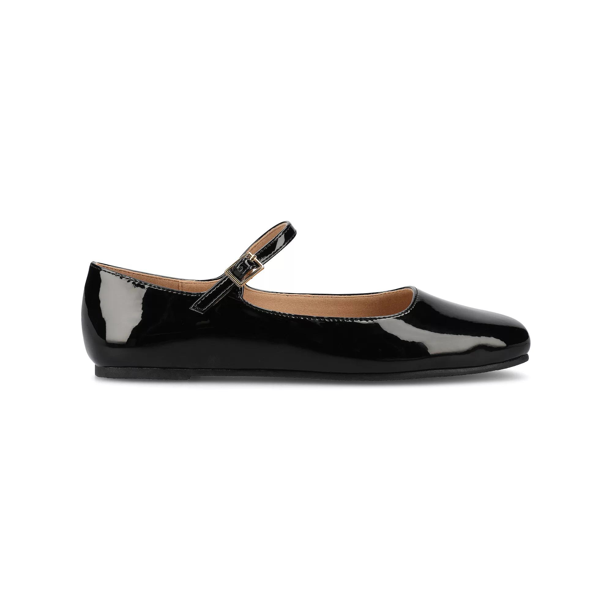These Journee Carrie flats will go with any outfit! Click this FOOTWEAR GUIDE to find the perfect fit and more! - https://www.kohls.com/feature/shoesizeguide.jsp. SHOE FEATURES: Mary jane style, Small buckle detail. SHOE CONSTRUCTION: Faux leather upper, Polyurethane lining, Manmade outsole. SHOE DETAILS: Square toe, Buckle closure, Padded footbed. Size: 6 Wide. Color: Black Patent. Gender: female. Age Group: adult.