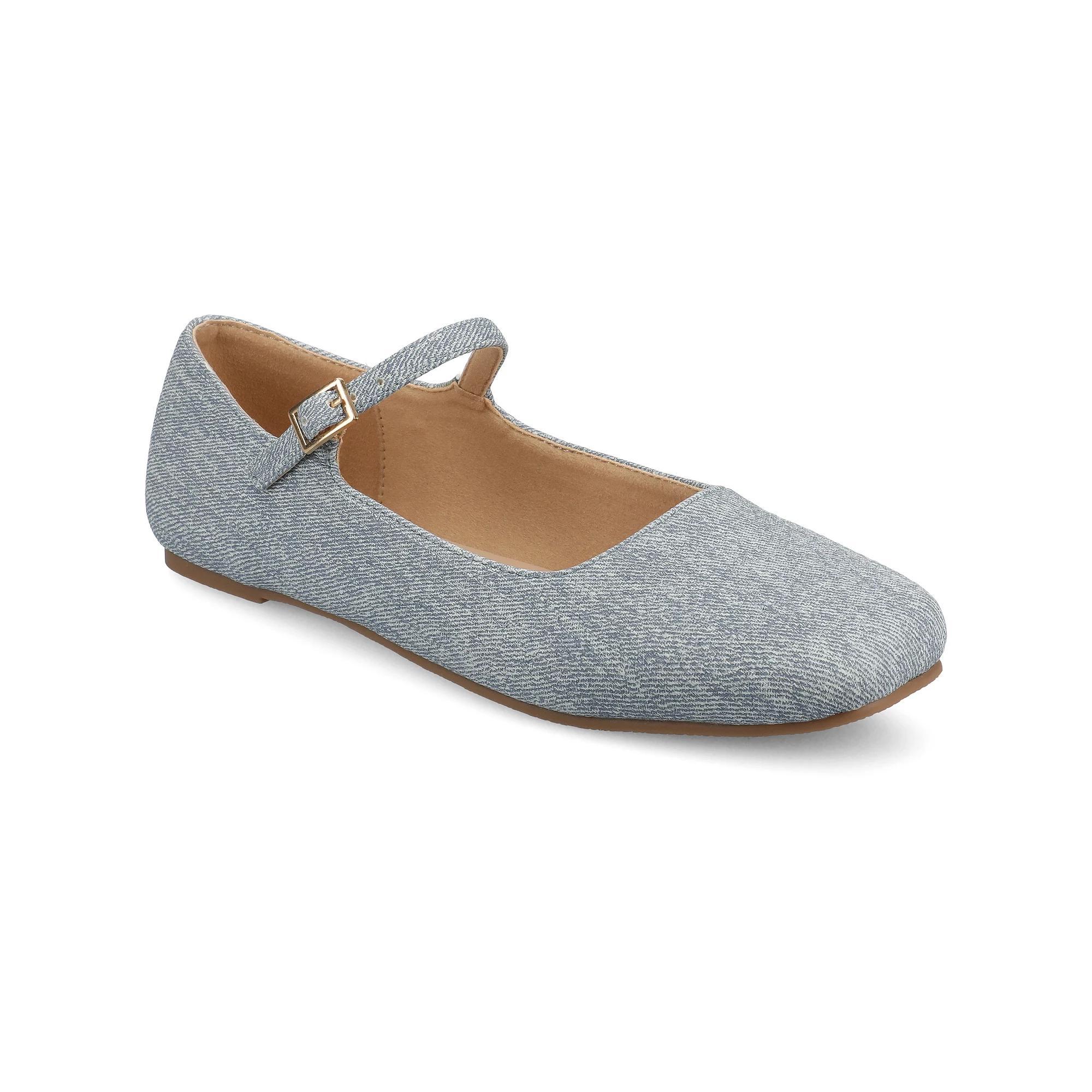 These Journee Carrie flats will go with any outfit! Click this FOOTWEAR GUIDE to find the perfect fit and more! - https://www.kohls.com/feature/shoesizeguide.jsp. SHOE FEATURES: Mary jane style, Small buckle detail. SHOE CONSTRUCTION: Faux leather upper, Polyurethane lining, Manmade outsole. SHOE DETAILS: Square toe, Buckle closure, Padded footbed. Size: 7. Color: Denim. Gender: female. Age Group: adult. Material: OTHER MATERIAL.
