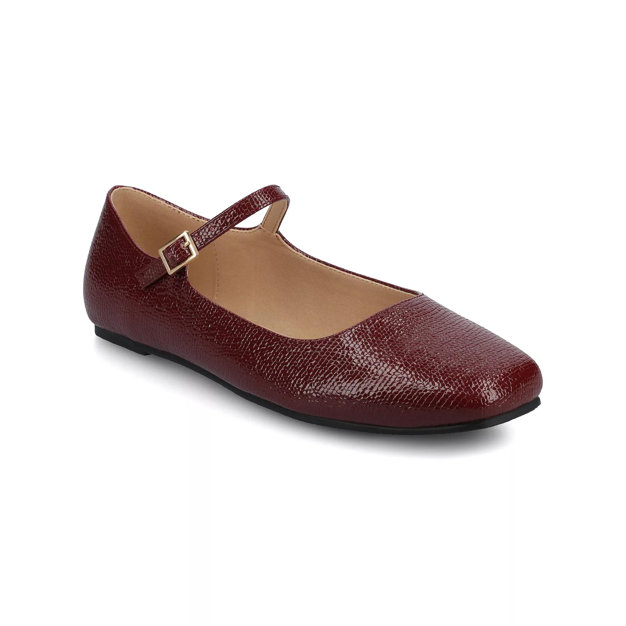 These Journee Carrie flats will go with any outfit! Click this FOOTWEAR GUIDE to find the perfect fit and more! - https://www.kohls.com/feature/shoesizeguide.jsp. SHOE FEATURES: Mary jane style, Small buckle detail. SHOE CONSTRUCTION: Faux leather upper, Polyurethane lining, Manmade outsole. SHOE DETAILS: Square toe, Buckle closure, Padded footbed. Size: 7 Wide. Color: Oxblood. Gender: female. Age Group: adult.