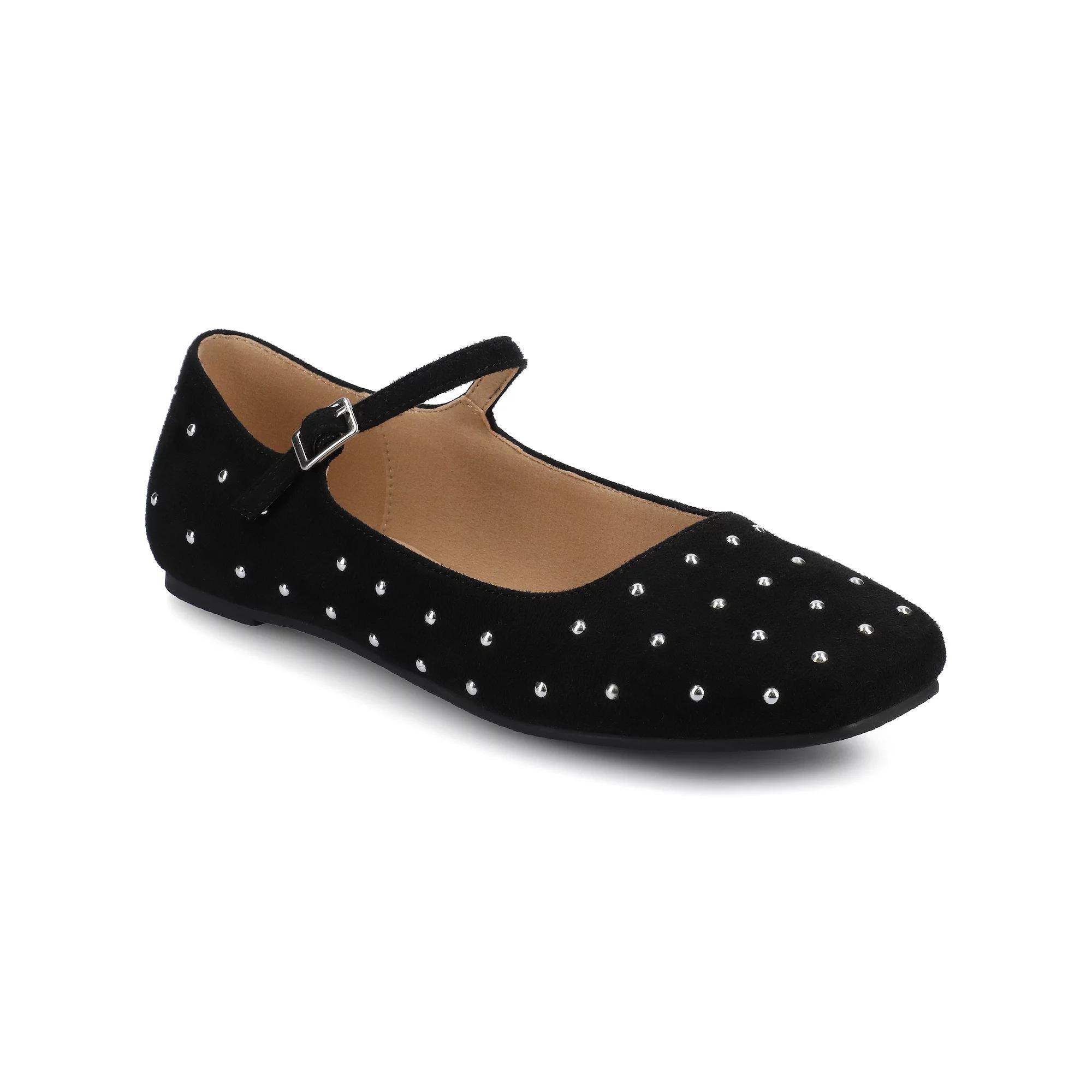 These Journee Carrie flats will go with any outfit! Click this FOOTWEAR GUIDE to find the perfect fit and more! - https://www.kohls.com/feature/shoesizeguide.jsp. SHOE FEATURES: Mary jane style, Small buckle detail. SHOE CONSTRUCTION: Faux leather upper, Polyurethane lining, Manmade outsole. SHOE DETAILS: Square toe, Buckle closure, Padded footbed. Size: 9 Wide. Color: Black Stud. Gender: female. Age Group: adult.