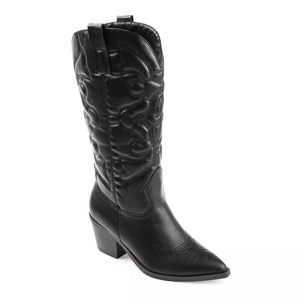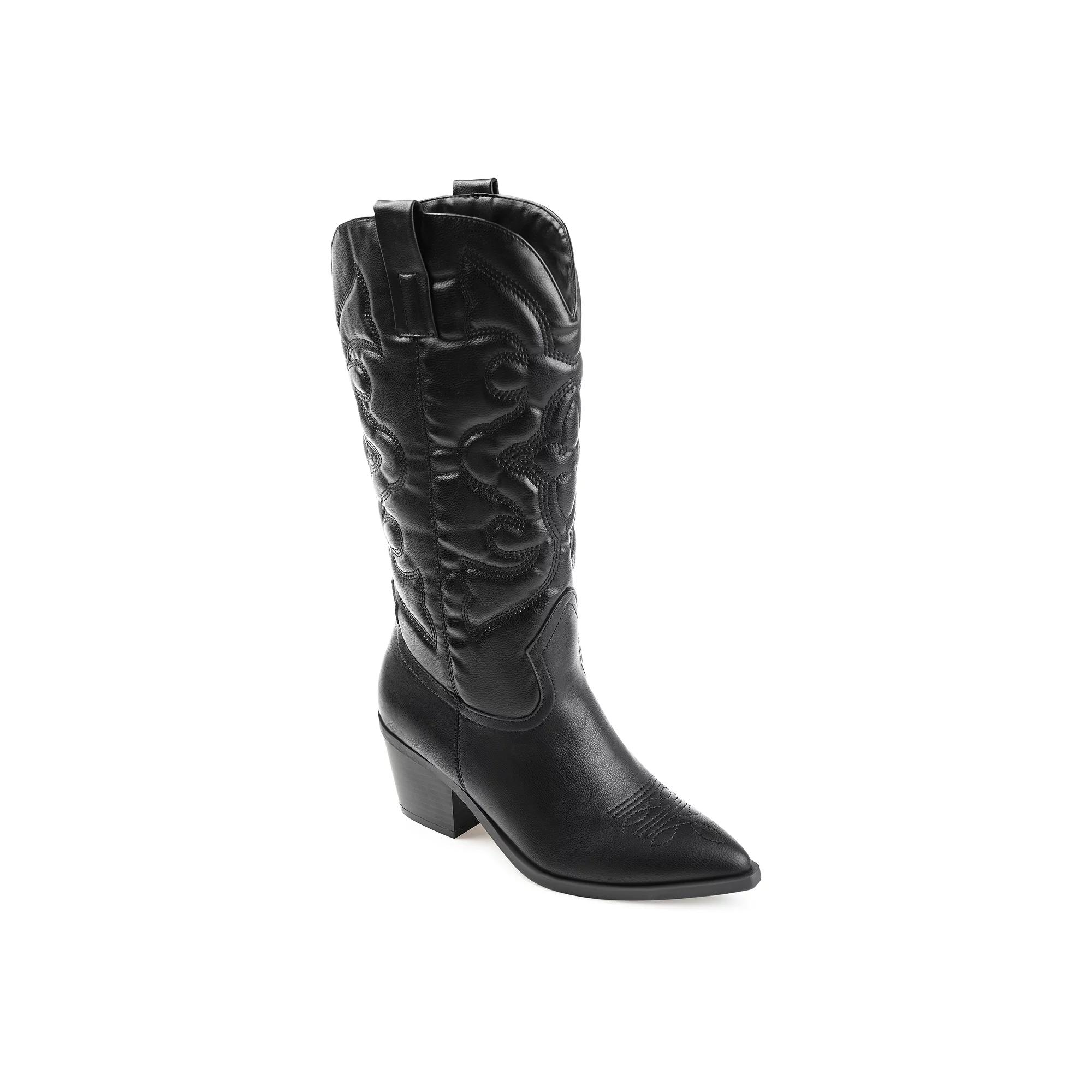 Meet the Chantry — your country roots just got a major glow-up. This pointed-toe bootie serves western stitch details and buttery soft faux leather that says "ranch chic" without the actual ranch work. Think Sunday brunch energy with Tuesday confidence.The block heel gives you that perfect lift while the 4mm Journee Comfort System Insole works behind the scenes, turning all-day wear into your secret advantage. Because when comfort becomes your superpower, you stop thinking about your feet and start thinking about everything else — like how good you look walking into that room.Mid-calf height meets modern style in a boot that doesn't just complete your outfit, it elevates your entire vibe. From coffee runs that turn into impromptu shopping trips to dinner dates where you want to look effortless but intentional, the Chantry adapts to your life, not the other way around.This is the boot that transforms "nice outfit" into "where did you get those?" — the kind of finishing touch that makes people assume you have your whole life together, even if you're just really good at picking shoes. Click this FOOTWEAR GUIDE to find the perfect fit and more! - https://www.kohls.com/feature/shoesizeguide.jsp. SHOE FEATURES: Western-style design, Embroidery detail, footbed. SHOE CONSTRUCTION: Faux leather upper, Fabric lining, Manmade outsole. SHOE DETAILS: Pointed toe, Pull-on, footbed, 2.75-in. heel, 12-in. shaft, 14.5-in. circumference. Size: 9 Wc. Color: Black. Gender: female. Age Group: adult. Material: SYNTHETIC.