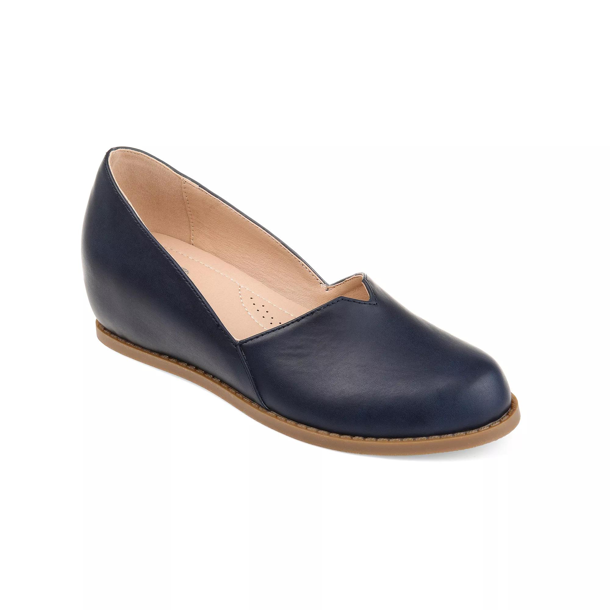 Add classic charm to any look with these Val wedges from Journee. SHOE FEATURES. Sleek silhouette, Durable traction sole. SHOE CONSTRUCTION. Faux leather upper, Polyurethane lining, Manmade outsole. SHOE DETAILS. Round toe, Slip-on, Padded footbed, 0.5-in. platform. Size: 10. Color: Navy. Gender: female. Age Group: adult. Material: OTHER MATERIAL.
