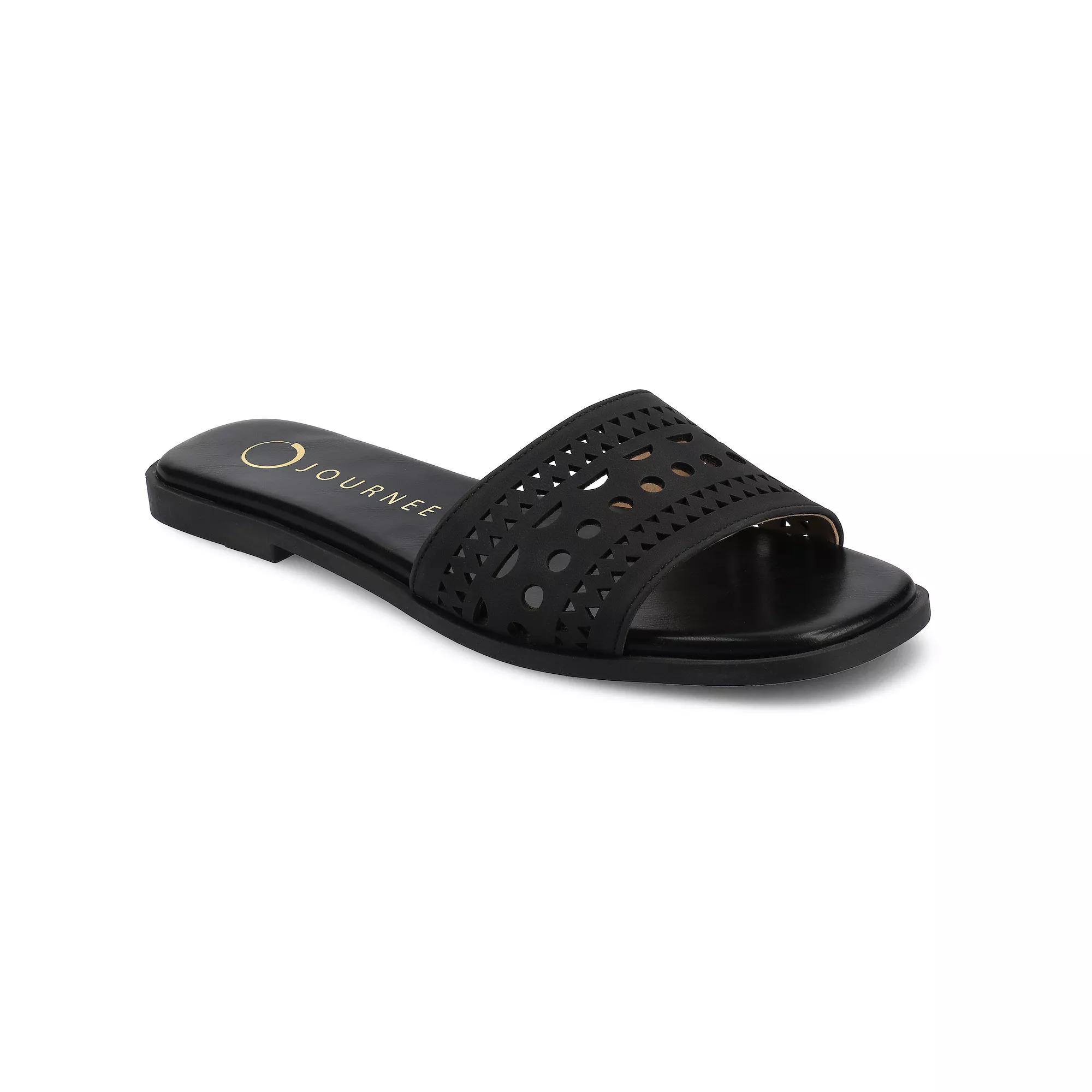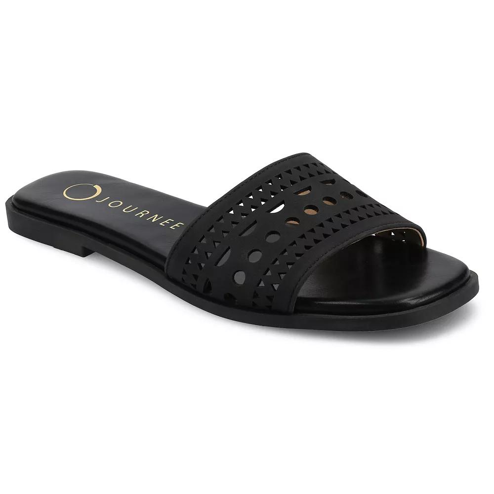 Step into summer style with the Journee Brodie women's slide sandals, designed for effortless comfort and chic appeal. These versatile sandals feature a stylish geometric cut-out design that makes them perfect for both casual outings and dressy occasions.FEATURES Decorative laser-cut geometric designsDETAILS Synthetic upper, lining, midsole, and outsole Polyurethane footbed Open toe Slip-on Spot clean Imported Size: 9.5. Color: Black. Gender: female. Age Group: adult.