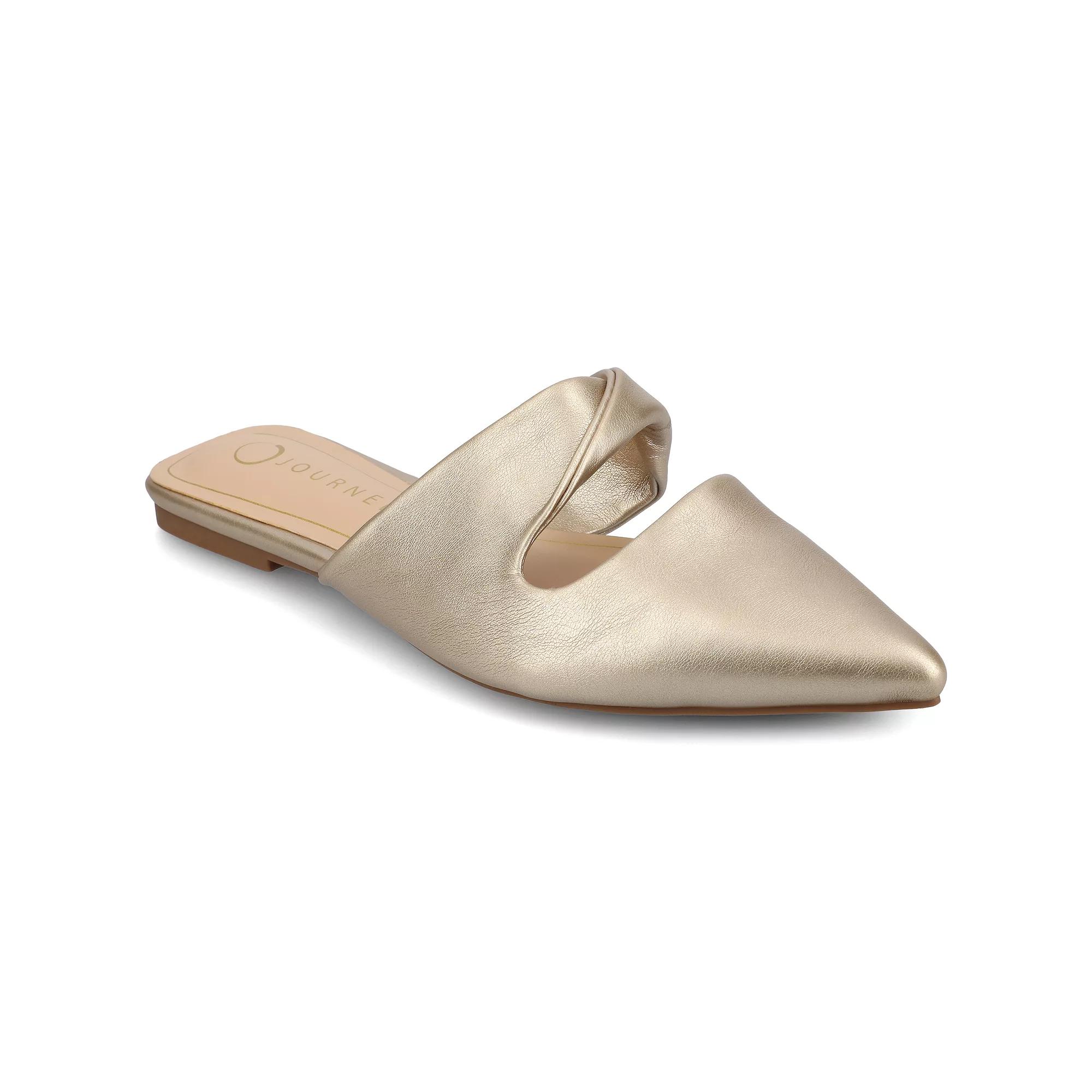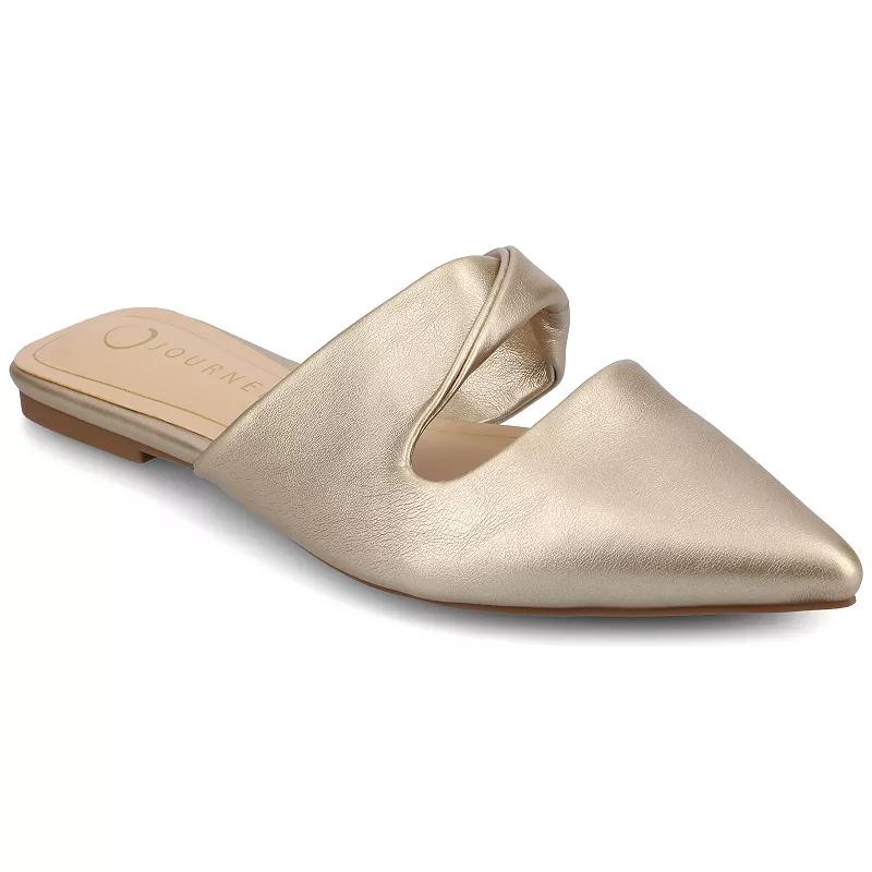 She'll love the comfort and cute style of these Journee Enniss Women's Mule Flats.Click this FOOTWEAR GUIDE to find the perfect fit and more!SHOE FEATURES Mule Twist & open side detailSHOE CONSTRUCTION Polyurethane lining Manmade outsole Faux leather upperSHOE DETAILS Spot clean Slip-on Pointed toeSETUP INFORMATION Imported Size: 6. Color: Champagne. Gender: female. Age Group: adult.