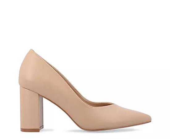 Want a pump that goes with almost everything in your wardrobe? Choose the Journee Collection Simonne pump. The pointed-toe pump made sustainable with its plush vegan synthetic upper, has a gorgeous sweetheart cut with a stitched outline. A coordinating block heel gives you that elevated look.