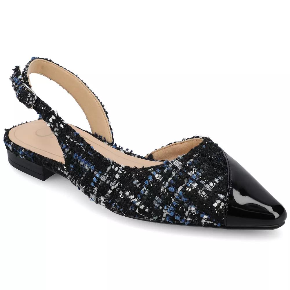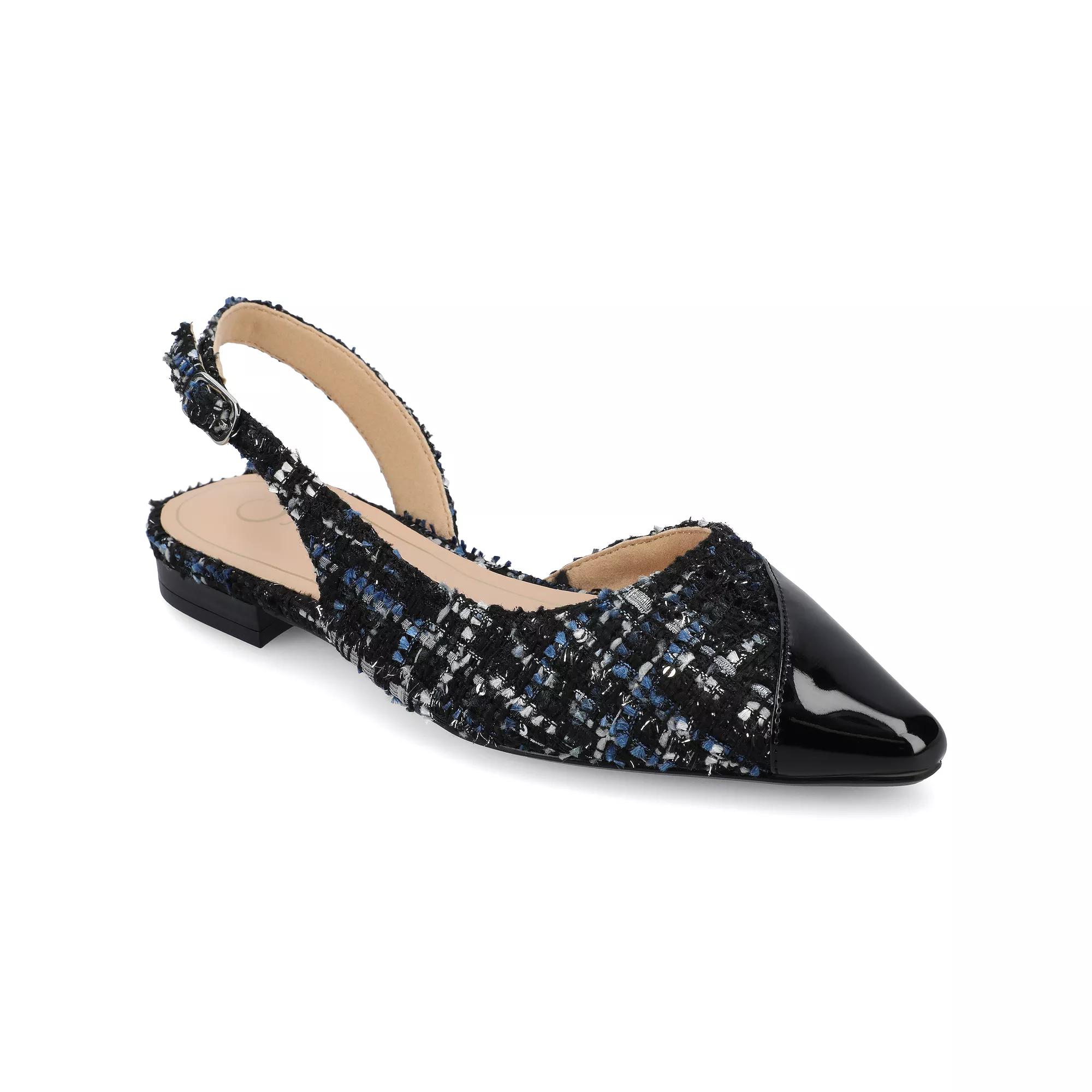 Step into sophisticated style with these Journee Daphnne women's flats. Click this FOOTWEAR GUIDE to find the perfect fit and more! - https://www.kohls.com/feature/shoesizeguide.jsp. FEATURES: Mixed material design, footbed for all day comfort, Stacked block heel, Ankle buckle closure for a secure fit. DETAILS: Man-made upper and outsole, Faux leather lining and midsole, Pointed toe, Buckle closure, footbed, 0.5-in. heel, Spot clean, Imported, Stacked block heel. Size: 6. Color: Black Tweed. Gender: female. Age Group: adult. Material: SYNTHETIC.