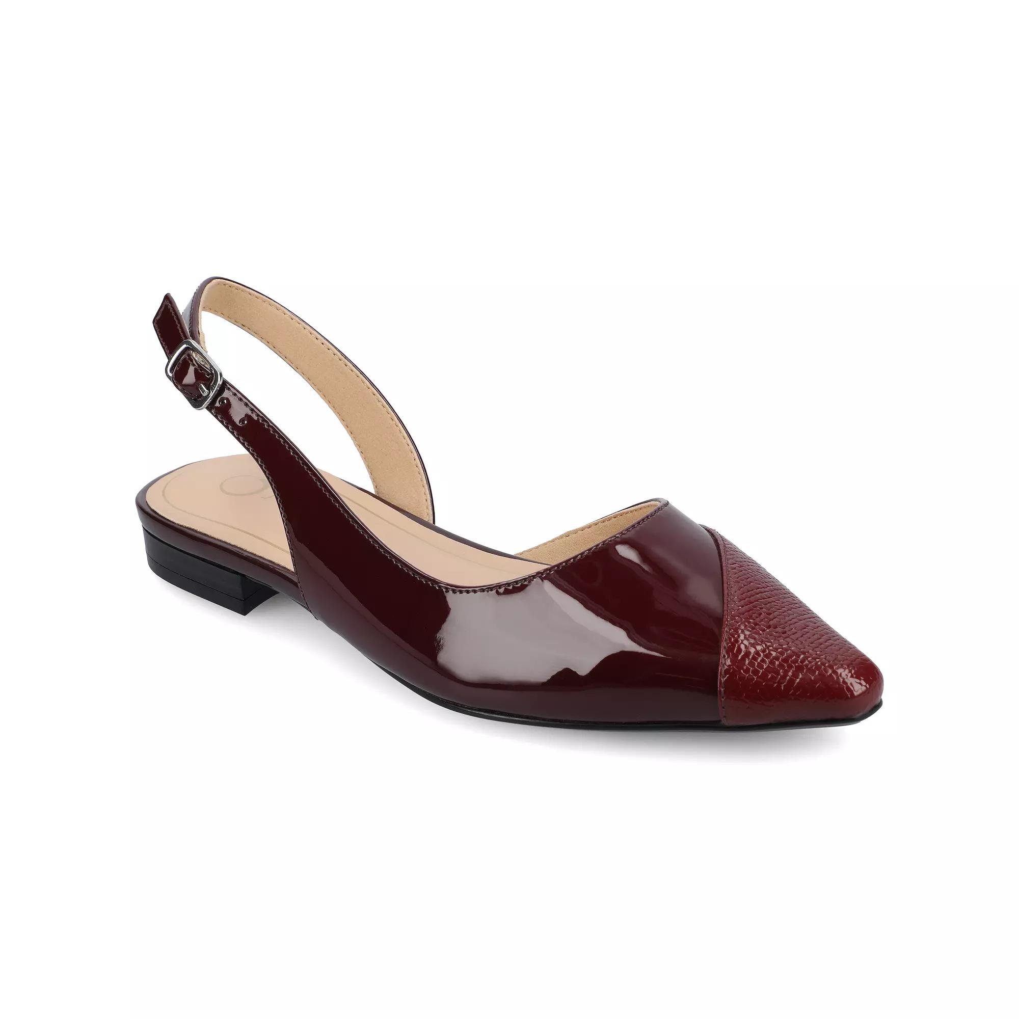 Step into sophisticated style with these Journee Daphnne women's flats. Click this FOOTWEAR GUIDE to find the perfect fit and more! - https://www.kohls.com/feature/shoesizeguide.jsp. FEATURES: Mixed material design, footbed for all day comfort, Stacked block heel, Ankle buckle closure for a secure fit. DETAILS: Man-made upper and outsole, Faux leather lining and midsole, Pointed toe, Buckle closure, footbed, 0.5-in. heel, Spot clean, Imported, Stacked block heel. Size: 7. Color: Oxblood. Gender: female. Age Group: adult. Material: SYNTHETIC.