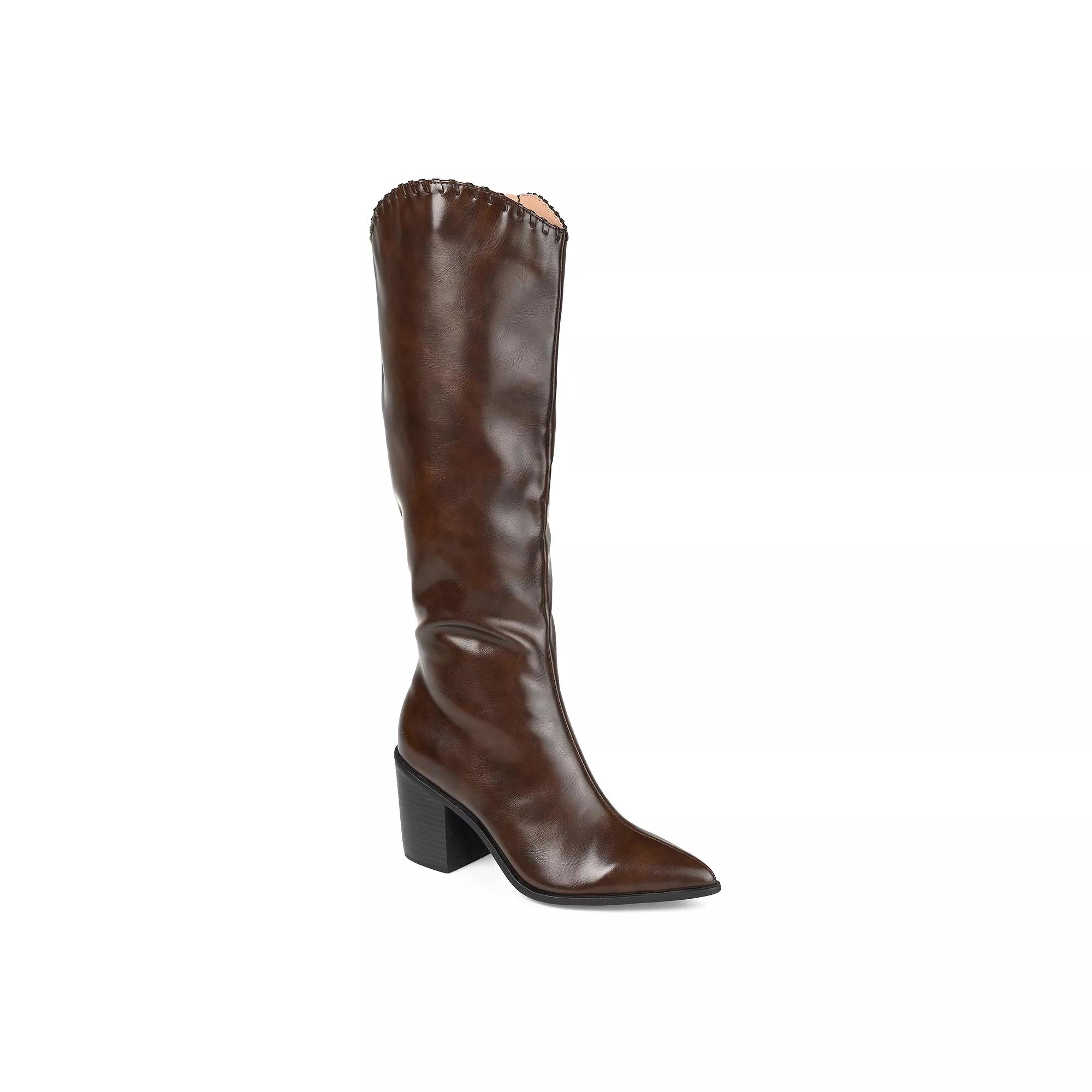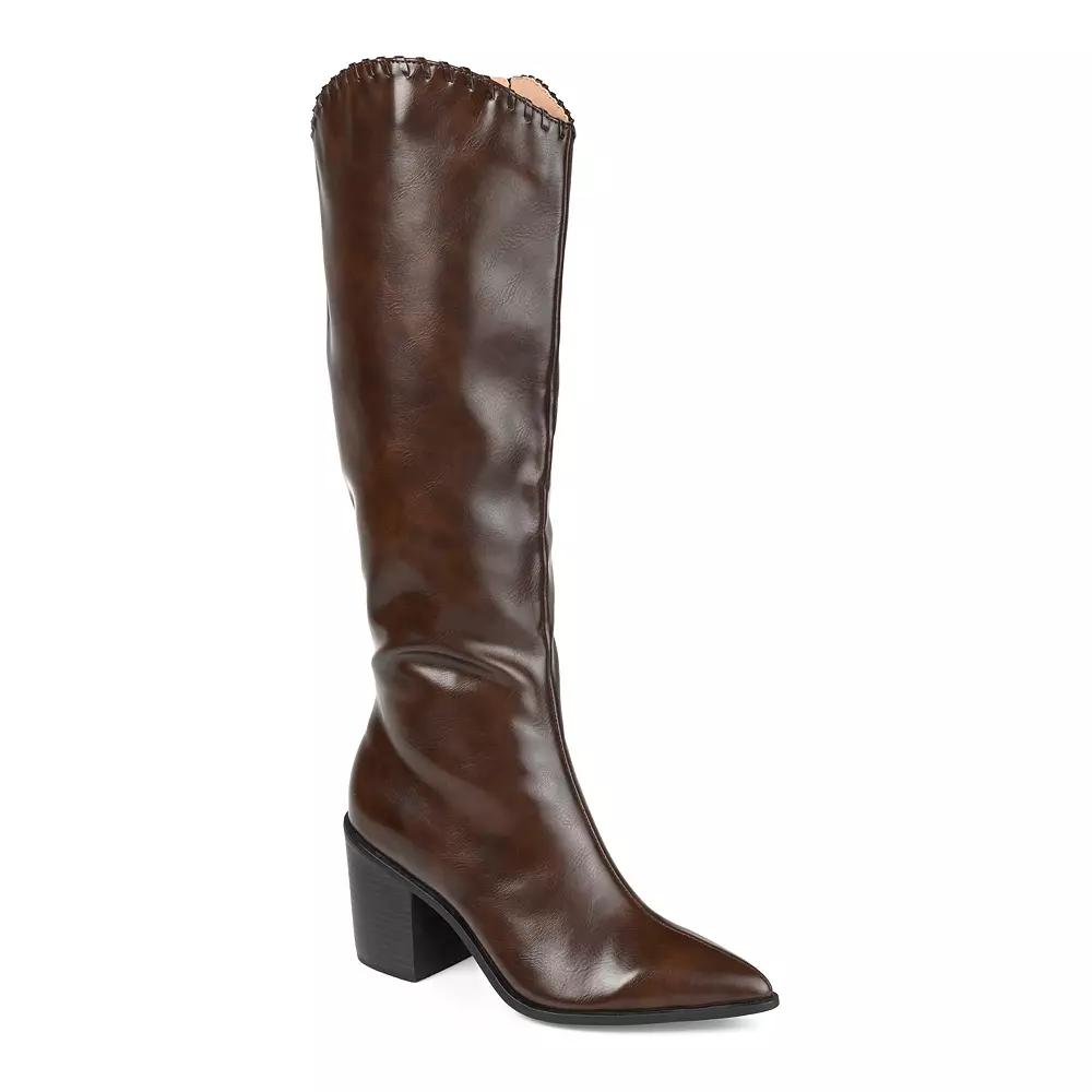 Step into western-inspired style with these Journee Daria women's knee-high boots. WC = Medium Width, Wide Calf. M XWC = Medium Width, Extra Wide Calf. W = Wide Width, Regular Calf. W WC = Wide Width, Wide Calf. W XWC = Wide Width, Extra Wide Calf. Click this FOOTWEAR GUIDE to find the perfect fit and more! - https://www.kohls.com/feature/shoesizeguide.jsp. BOOT FEATURES: Whipstitch detail, foobted, Stacked heel. BOOT CONSTRUCTION: Faux leather upper, Fabric lining, Manmade outsole. BOOT DETAILS: Pointed toe, Zipper closure, footbed, 3.25-in. heel, 14-in. shaft, 14.5-in. circumference, 15-in. wide circumference, 16-in. extra wide circumference. Size: 6 Wide. Color: Brown. Gender: female. Age Group: adult. Material: SYNTHETIC.