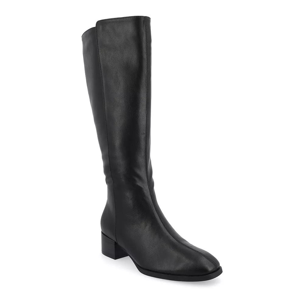 Step into style with these Journee Devri women's knee-high boots. Click this FOOTWEAR GUIDE to find the perfect fit and more! - https://www.kohls.com/feature/shoesizeguide.jsp. FEATURES: Stacked block heel, Center seam detail. DETAILS: Faux leather upper & midsole, Faux fur lining, Manmade outsole, Square toe, Zipper closure, footbed, 1.5-in. heel, 14-in. shaft, 14-in. circumference, Spot clean, Imported. Size: 10 M XWc. Color: Black. Gender: female. Age Group: adult.