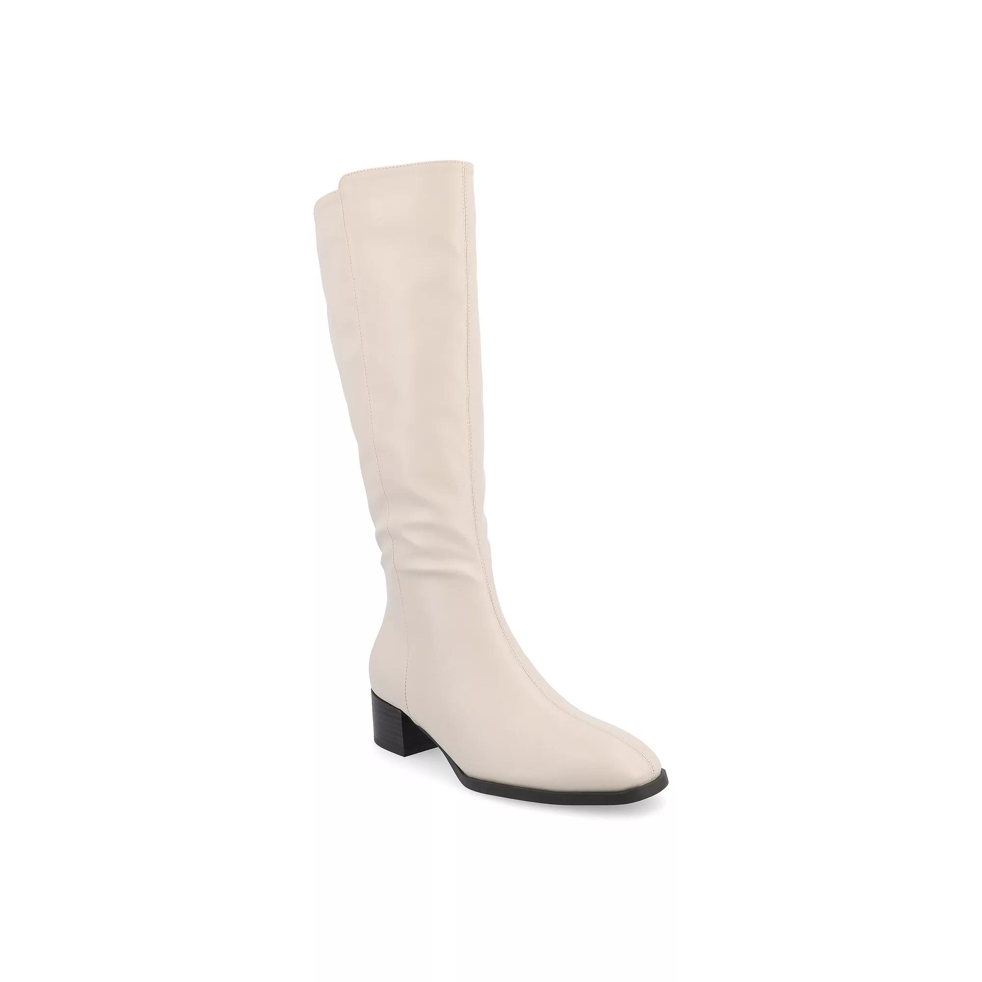 Step into style with these Journee Devri women's knee-high boots. Click this FOOTWEAR GUIDE to find the perfect fit and more! - https://www.kohls.com/feature/shoesizeguide.jsp. FEATURES: Stacked block heel, Center seam detail. DETAILS: Faux leather upper & midsole, Faux fur lining, Manmade outsole, Square toe, Zipper closure, footbed, 1.5-in. heel, 14-in. shaft, 14-in. circumference, Spot clean, Imported. Size: 10 M XWc. Color: Bone. Gender: female. Age Group: adult.