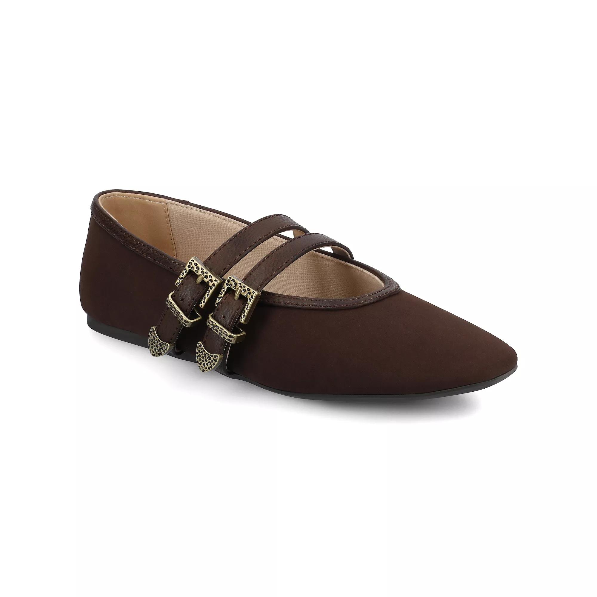 The Florene Mary-Jane flat by Journee is a chic and versatile shoe featuring an elegant almond-toe design and multiple buckle straps for a secure yet stylish fit. Crafted from high-quality faux leather, it offers a sleek and polished look suitable for both casual and dressy occasions. With its signature 4 mm Journee Comfort System™ Insole, this flat ensures all-day comfort and support, making it a must-have addition to any wardrobe. Crafted with exceptional quality and designed for an ideal fit, this style brings together trend-forward aesthetics and lasting comfort. Click this FOOTWEAR GUIDE to find the perfect fit and more! - https://www.kohls.com/feature/shoesizeguide.jsp. FEATURES: Buckle detail, Luxe upper material, Comfort system insole. DETAILS: Man-made upper, lining & midsole, Rubber outsole, Almond toe, Buckle closure, Foam footbed, Spot clean, Imported. Size: 10. Color: Chocolate. Gender: female. Age Group: adult. Material: SYNTHETIC.