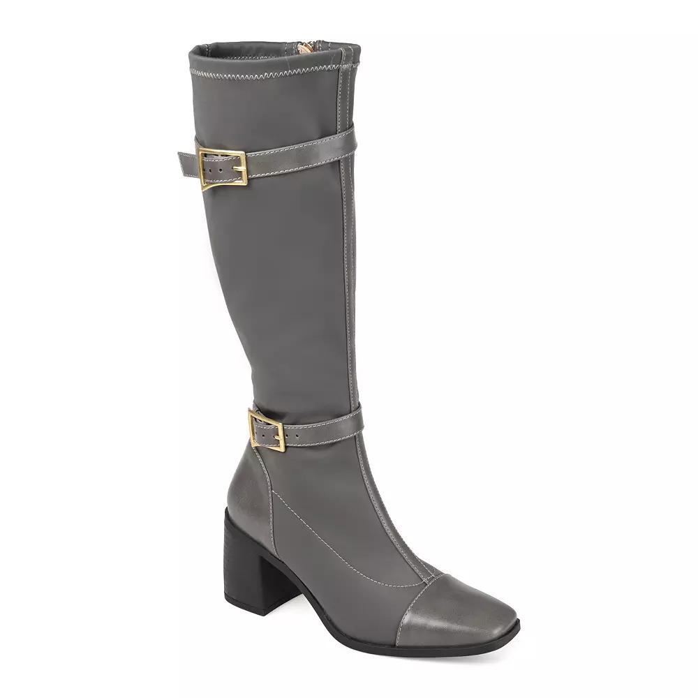 These Gaibree knee-high boots from Journee feature adorable strap and buckle details and a stylish square toe, making them the perfect finishing touch for just about any outfit. WC = Medium Width, Wide Calf. M XWC = Medium Width, Extra Wide Calf. W = Wide Width, Regular Calf. W WC = Wide Width, Wide Calf. W XWC = Wide Width, Extra Wide Calf. Click this FOOTWEAR GUIDE to find the perfect fit and more! - https://www.kohls.com/feature/shoesizeguide.jsp. BOOT FEATURES: Stretch gore design, Full inside zipper for easy on and off, Tru Comfort Foam™ for added comfort and support. BOOT CONSTRUCTION: Faux leather upper, Fabric lining, Manmade outsole. BOOT DETAILS: Square toe, Zipper closure, Foam footbed, 2.75-in. heel, 14-in. shaft, 13.5-in. circumference, 14.25 wide calf circumference, 14-in. extra wide calf circumference. Size: 8 M XWc. Color: Gray. Gender: female. Age Group: adult. Material: SYNTHETIC.