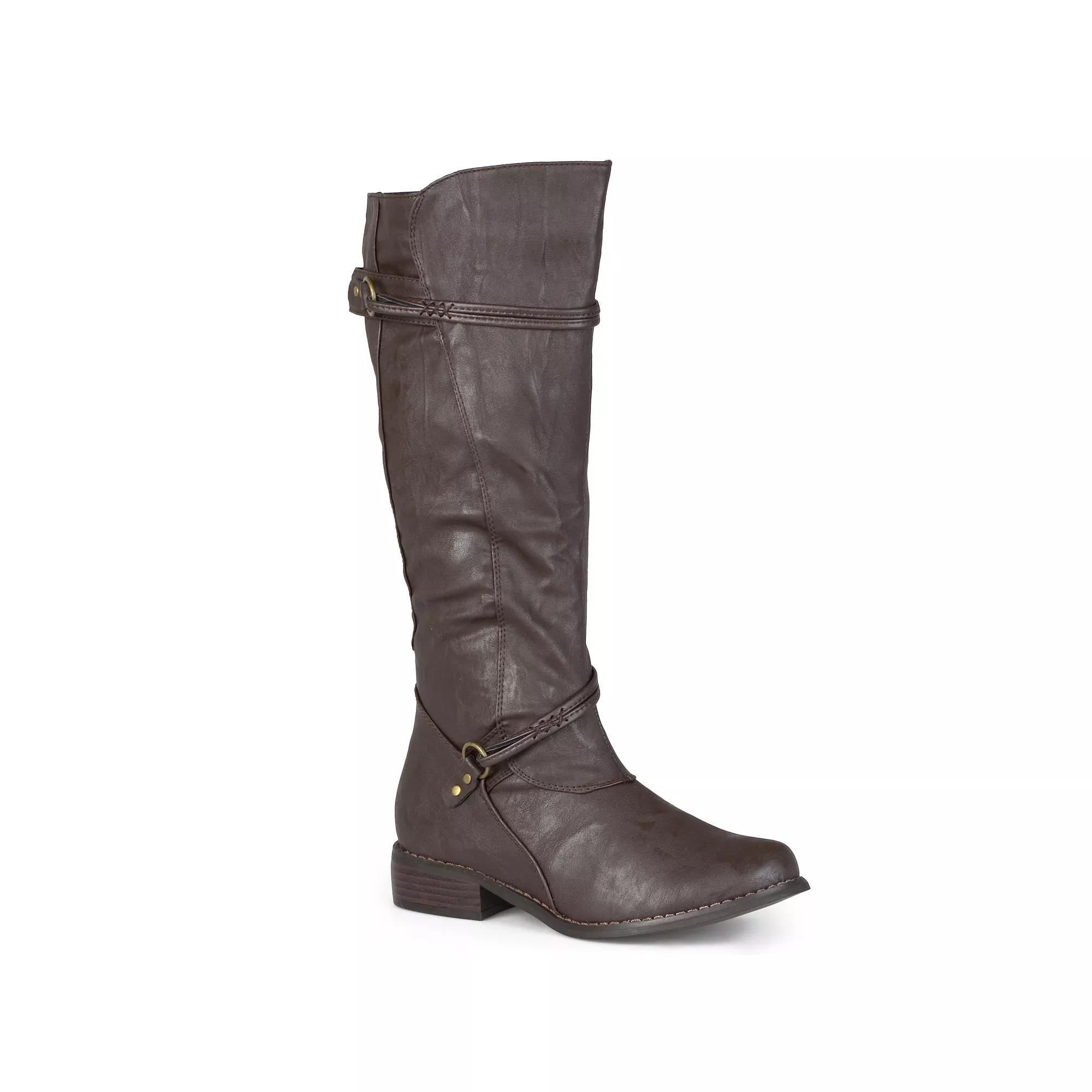 Display your fierce fashion sense in these Harley knee-high riding boots from Journee Collection.WC = wide calf; XWC = extra wide calfWatch the video to find out how to perfectly fit your boots.BOOT FEATURES Side zipper ensures easy on and off Low heel offers stability and comfort BOOT CONSTRUCTION Manmade upper / lining TPR outsole BOOT DETAILS Round toe Zipper closure Lightly padded footbed 1-in. heel 14-in. shaft 16-in. circumference 17-in. WC circumference 18-in. XWC circumference Size: 6.5. Color: Brown. Gender: female. Age Group: adult.