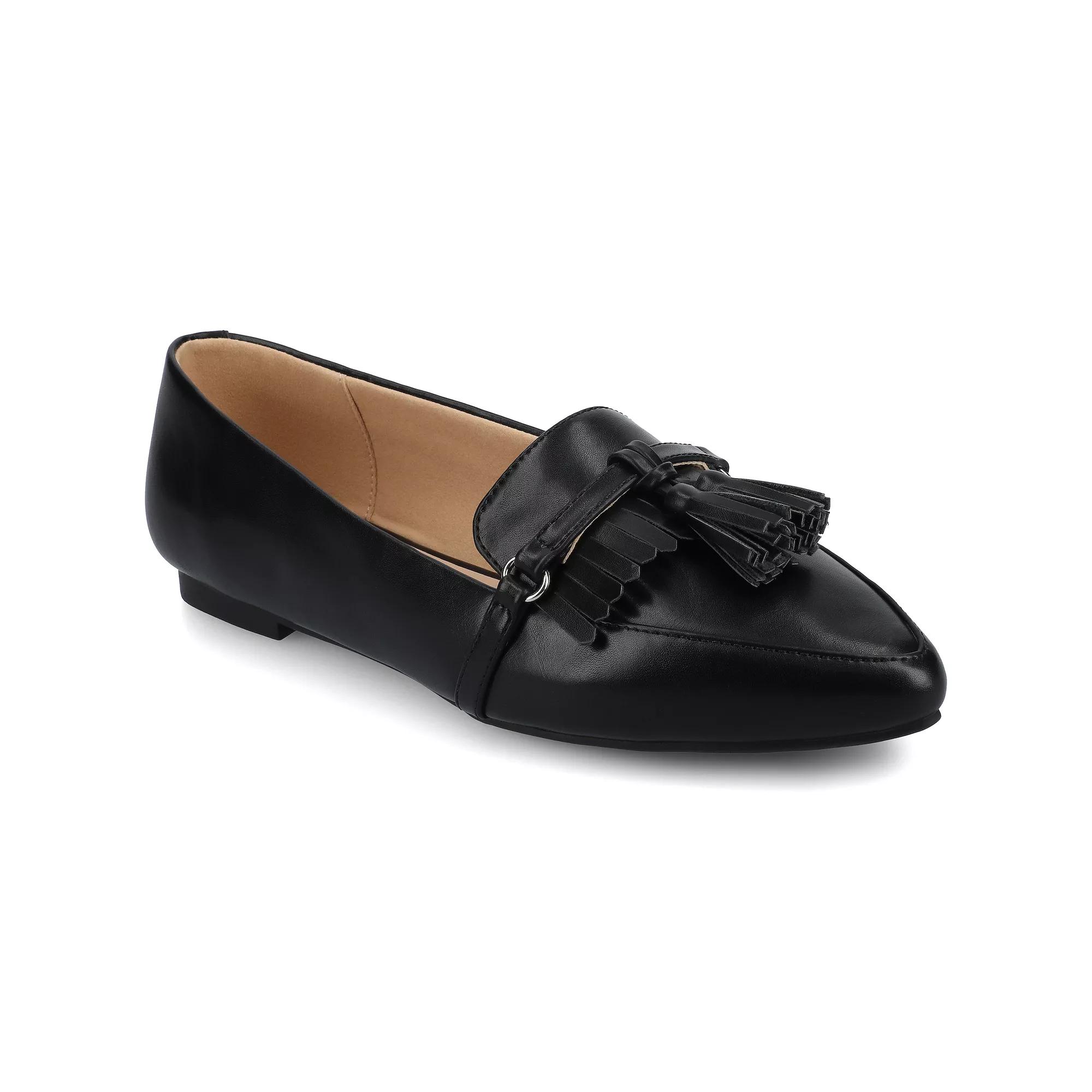 Discover effortless elegance with these chic loafers from Journee. Featuring a stylish pointed toe and trendy tassel detail, they offer the perfect blend of comfort and sophistication, making them ideal for both casual outings and formal settings. Slip into these versatile flats and elevate your look with ease! WC = Medium Width, Wide Calf. M XWC = Medium Width, Extra Wide Calf. W = Wide Width, Regular Calf. W WC = Wide Width, Wide Calf. W XWC = Wide Width, Extra Wide Calf. Click this FOOTWEAR GUIDE to find the perfect fit and more! - https://www.kohls.com/feature/shoesizeguide.jsp. FEATURES: Comfortable insole, Fit on WIDE SIZES ONLY is large. Please size down at least ½ size for a better fit. DETAILS: Man-made lining, upper, & midsole, Rubber outsole, Pointed toe, Slip-on, Foam footbed, Spot clean, Imported. Size: 6. Color: Black. Gender: female. Age Group: adult. Material: SYNTHETIC.