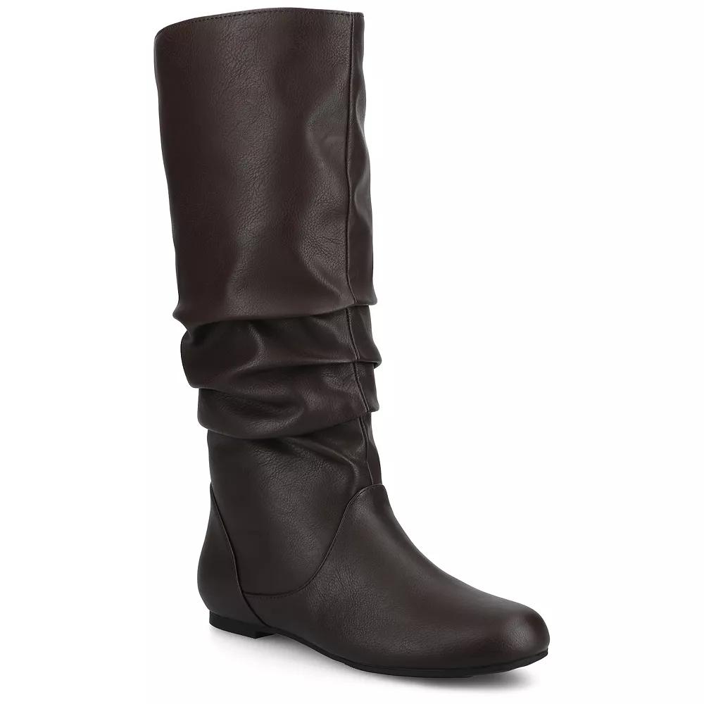 With a sleek silhouette and cool ruched style, you'll make a statement anywhere in these riding boots from Journee. WC = Medium Width, Wide Calf. M XWC = Medium Width, Extra Wide Calf. W = Wide Width, Regular Calf. W WC = Wide Width, Wide Calf. W XWC = Wide Width, Extra Wide Calf. Click this FOOTWEAR GUIDE to find the perfect fit and more! - https://www.kohls.com/feature/shoesizeguide.jsp. FEATURES: Mid-calf height, Ruched material design. DETAILS: Faux leather upper, Fabric lining, Man-made midsole and outsole, Round toe, Pull-on, Polyurethane footbed, 0.5-in. platform, 15-in. shaft height, 14.75-in. shaft circumference, 16.75-in. WC shaft circumference, 18-in. XWC shaft circumference, Spot clean, Imported. Size: 9.5 M XWc. Color: Brown. Gender: female. Age Group: adult. Pattern: Solid.