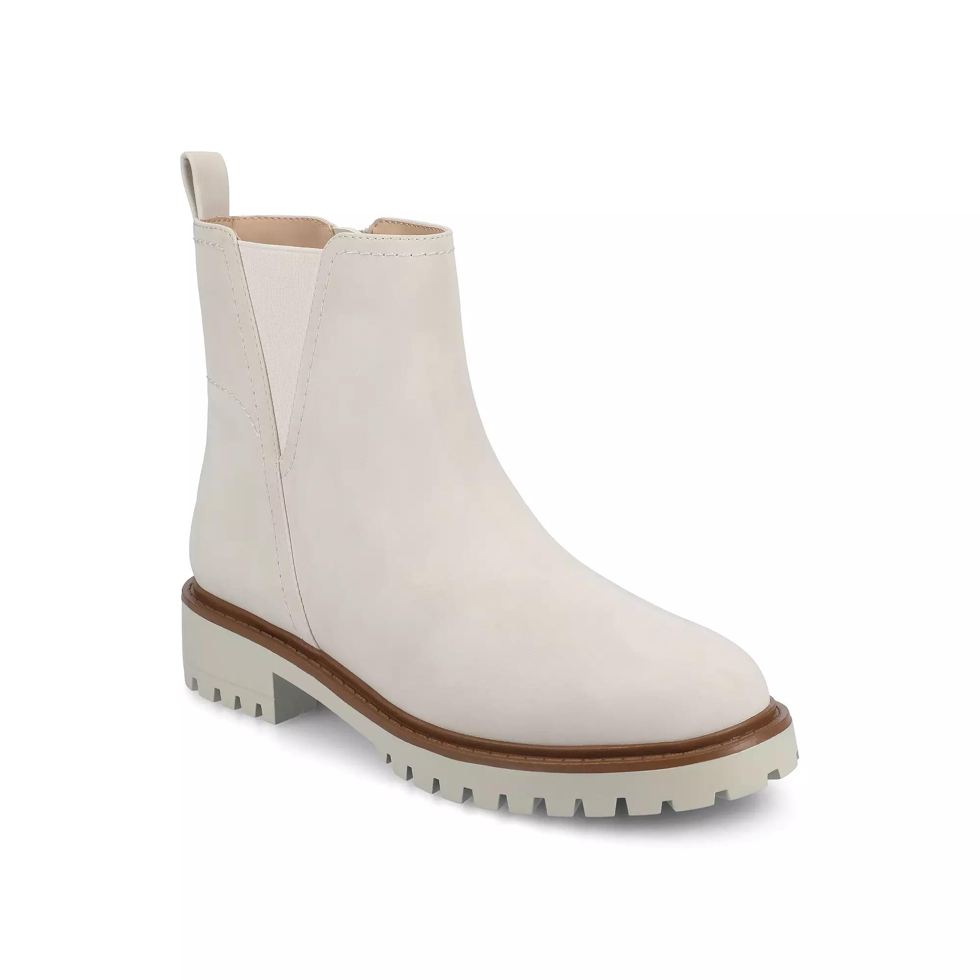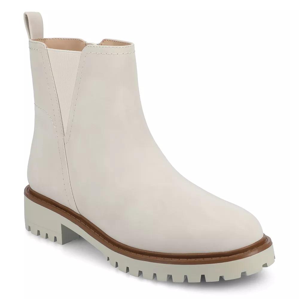 The Junnah pull-on Chelsea boot by Journee is a perfect blend of effortless style and lasting comfort, featuring a sleek round-toe design and convenient pull-on construction. With stretch gore panels, these boots provide a flexible yet secure fit, making them easy to slip on and off. Enhanced by a 1 1/4-inch block heel and a signature 4 mm Journee Comfort System™ Insole, they offer both subtle height and superior cushioning for all-day wear. Crafted with exceptional quality and designed for an ideal fit, this style brings together trend-forward aesthetics and lasting comfort. Click this FOOTWEAR GUIDE to find the perfect fit and more! - https://www.kohls.com/feature/shoesizeguide.jsp. FEATURES: Comfortable insole. DETAILS: Manmade lining, outsole, upper, & midsole, Round toe, Pull-on, Foam footbed, 1.25-in. heel height, 5-in. shaft height, 10-in. shaft circumference, Spot clean, Imported. Size: 6 Wide. Color: Bone. Gender: female. Age Group: adult. Material: SYNTHETIC.