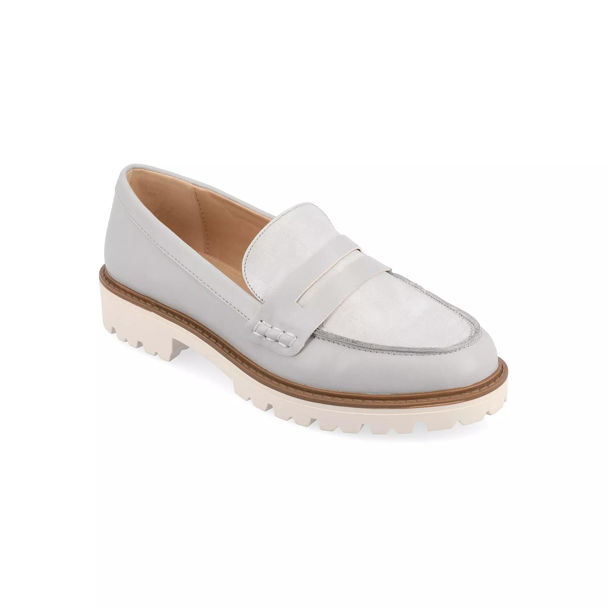These Journee Kenly women's loafers are perfect for the office. Click this FOOTWEAR GUIDE to find the perfect fit and more! - https://www.kohls.com/feature/shoesizeguide.jsp. SHOE FEATURES: Penny slot overlay, footbed, Treaded outsole. SHOE CONSTRUCTION: Faux leather upper, Polyurethane lining, Manmade outsole. SHOE DETAILS: Round toe, Slip-on, footbed, 1-in. platform. Size: 9. Color: Gray. Gender: female. Age Group: adult. Material: SYNTHETIC.