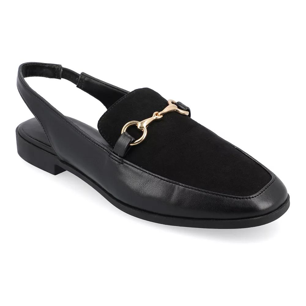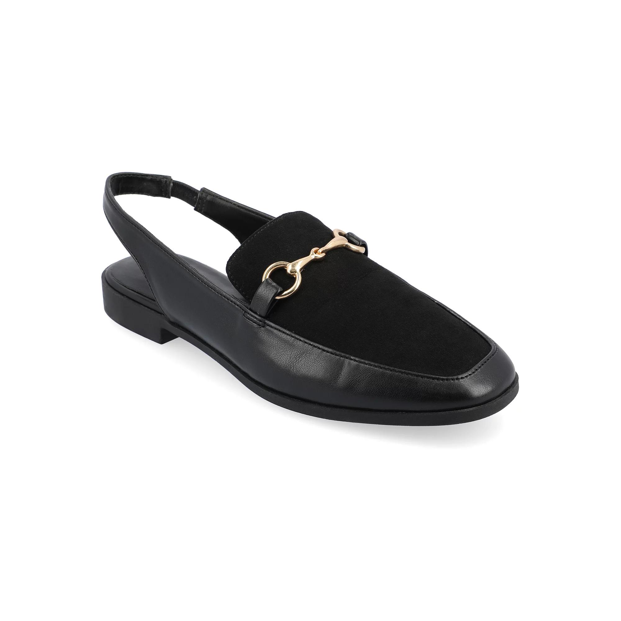 Dress up your look with the modern style and all-day comfort of these Journee Lainey Women's Flats. Click this FOOTWEAR GUIDE to find the perfect fit and more! - https://www.kohls.com/feature/shoesizeguide.jsp. FEATURES: Block Heel, Loafer, Sling Back, Hardware Detail. DETAILS: Faux Leather upper, Fabric lining, Faux Leather midsole, Man-made outsole, Square toe, Pull-on, footbed, .5-in. heel height, Spot clean, Imported. Size: 6.5. Color: Black. Gender: female. Age Group: adult. Material: SYNTHETIC.
