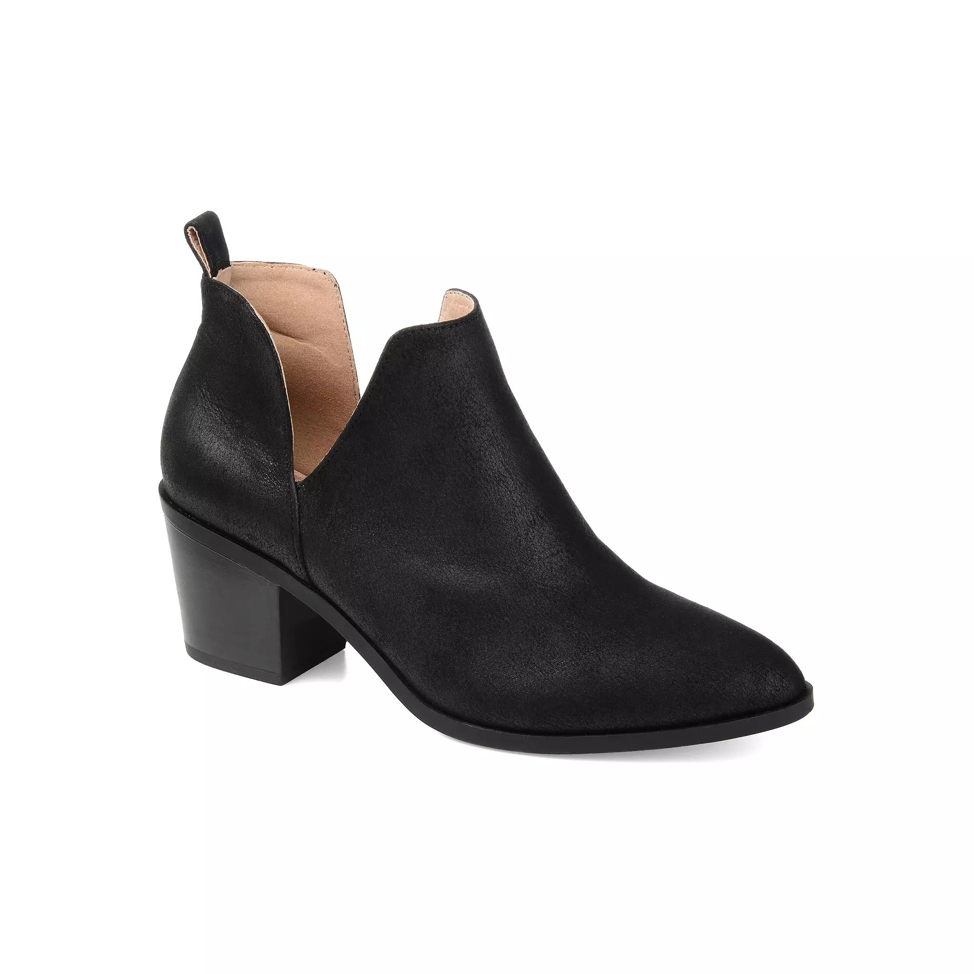 Meet Lola — the bootie that gets it. With her distressed finish and those perfectly placed V cut-outs, she's giving effortless cool without trying too hard. That almond toe? Pure sophistication. The multiple patterns? Your closet's new best friend who plays well with everything.From conference calls to cocktails, Lola moves through your day like she belongs everywhere — because she does. The Journee Comfort System works behind the scenes, turning those long days into easy wins. Comfort that keeps up with your schedule isn't just nice to have — it's your secret weapon.This is the bootie that works harder than your favorite jeans and looks better than your weekend plans. You'll reach for her without thinking, then wonder how you ever lived without her.Because some shoes just know how to make everything look intentional — even when you're winging it. Click this FOOTWEAR GUIDE to find the perfect fit and more! - https://www.kohls.com/feature/shoesizeguide.jsp. SHOE FEATURES: Almond toe shape with a deep side "V" cut outs, Durable traction sole. SHOE CONSTRUCTION: Faux leather, faux suede upper, Fabric lining, Manmade, rubber outsole. SHOE DETAILS: Almond toe, Pull-on, Padded footbed, 3.5-in. shaft, 10.5-in. circumference, 0.5-in. platform, 2.5-in. heel. Color: Black. Gender: female. Age Group: adult. Material: SYNTHETIC.