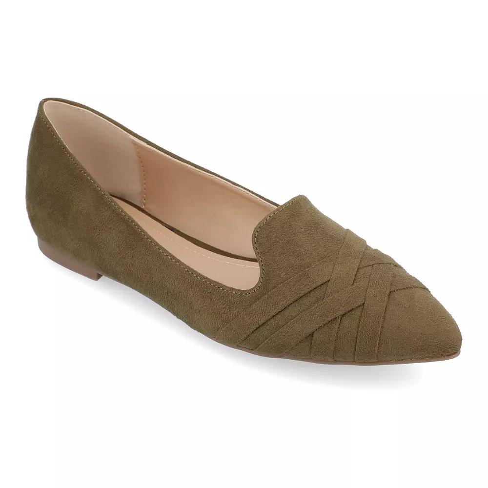 Embellish your ensemble with the eye-catching style of these Journee Mindee flats. Click this FOOTWEAR GUIDE to find the perfect fit and more! - https://www.kohls.com/feature/shoesizeguide.jsp. SHOE FEATURES. Strappy crisscross design, Durable traction sole. SHOE CONSTRUCTION. Faux suede upper, Fabric lining, Manmade, rubber outsole. SHOE DETAILS. Pointed toe, Slip-on, Padded footbed. Size: 7.5 Wide. Color: Olive. Gender: female. Age Group: adult. Material: SYNTHETIC.