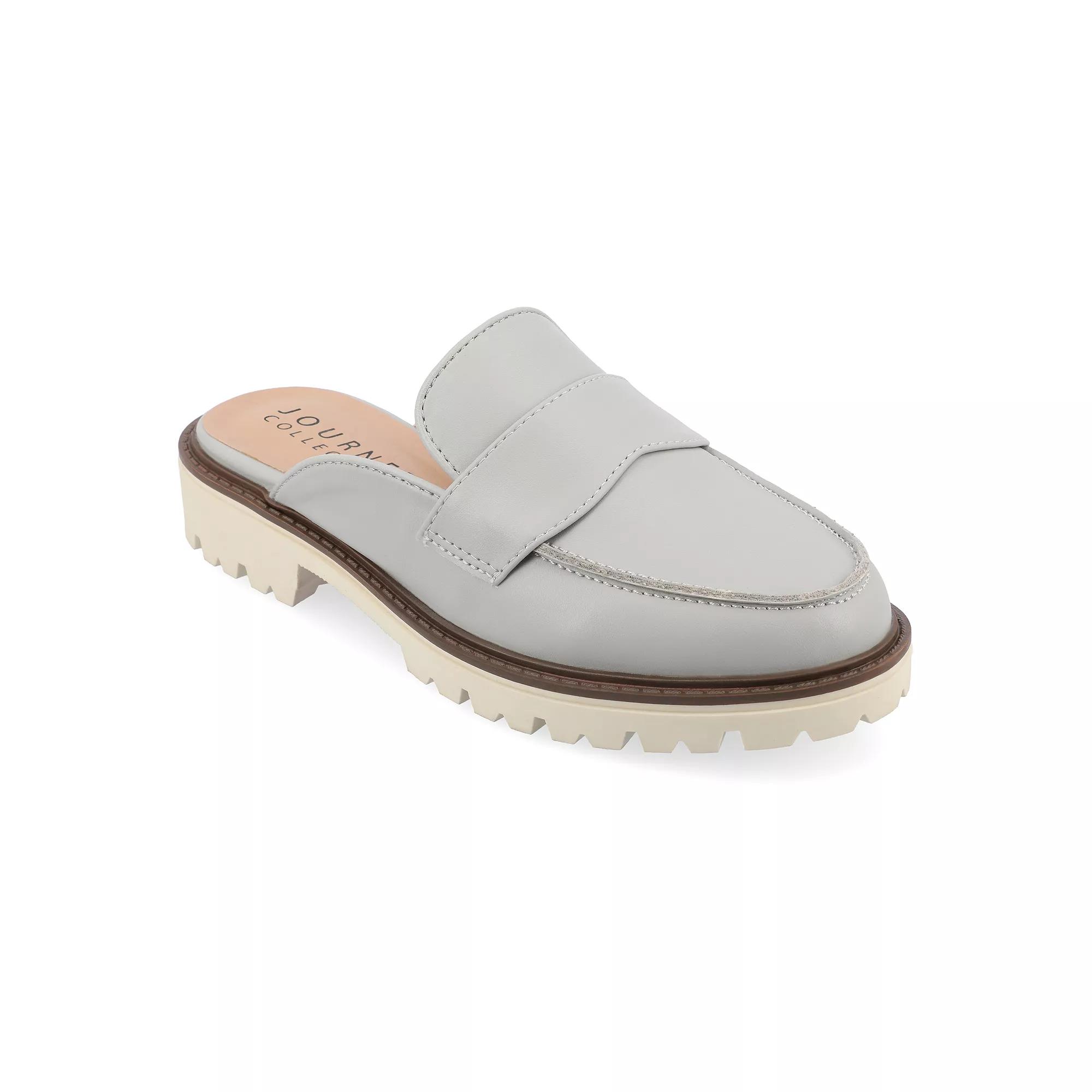 Step into comfort and style with these Journee Miycah women's mule flats. Click this FOOTWEAR GUIDE to find the perfect fit and more! - https://www.kohls.com/feature/shoesizeguide.jsp. FEATURES: Mule style, footbed for all day comfort, Slip-on for easy on and off. DETAILS: Faux leather upper, lining and midsole, Man-made outsole, Almond toe, Slip-on, footbed, 1.25-in. heel, 0.5-in. platform, Spot clean, Imported, Mule style. Size: 8.5. Color: Gray. Gender: female. Age Group: adult.