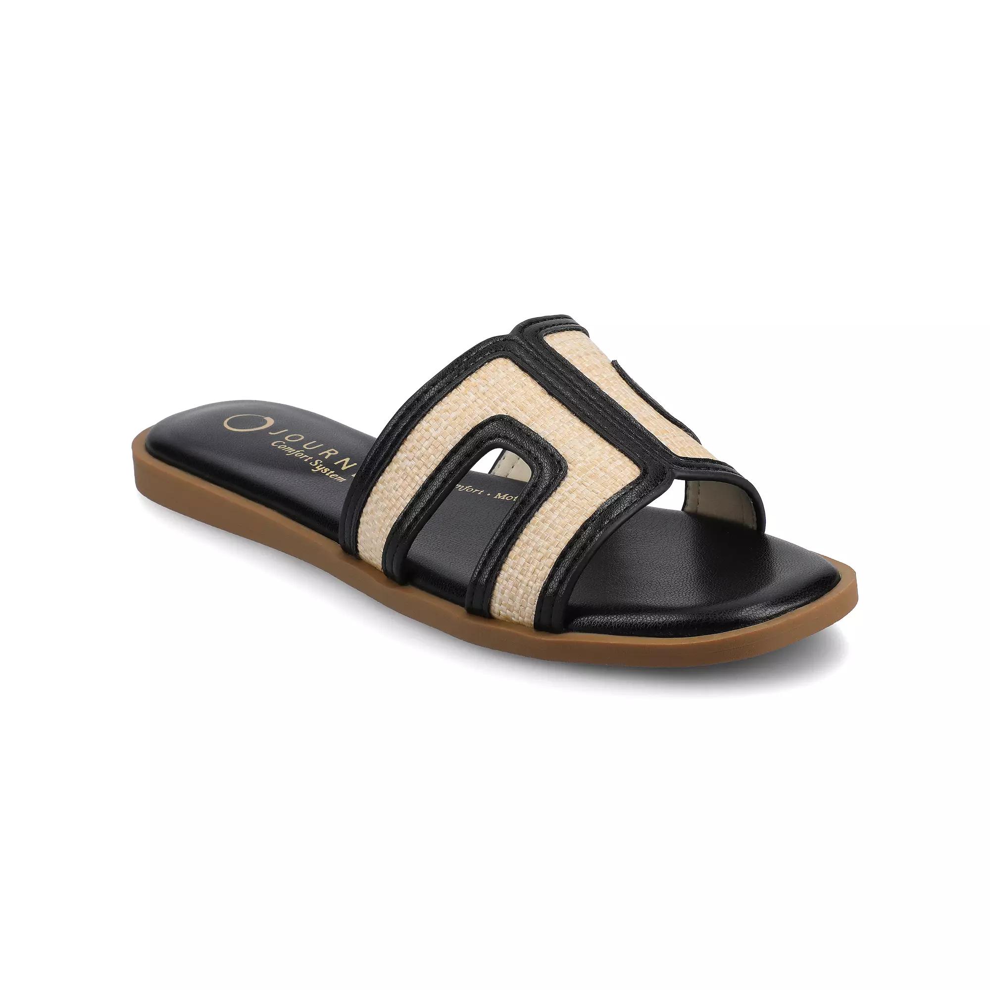 Comfortable and stylish, these women's sandals from Journee are perfect for warm, sunny days. Click this FOOTWEAR GUIDE to find the perfect fit and more! - https://www.kohls.com/feature/shoesizeguide.jsp. FEATURES: Slip-on for easy on and off, Open square toe. DETAILS: Synthetic upper, lining, midsole and outsole, Open toe, Slip-on, Polyurethane footbed, Spot clean, Imported. Size: 11. Color: Black Natural Raffia. Gender: female. Age Group: adult.