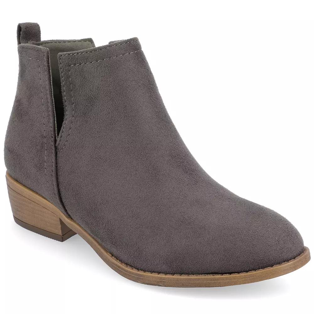 Trendy style is easy with these women's Rimi ankle boots from Journee. Click this FOOTWEAR GUIDE to find the perfect fit and more! - https://www.kohls.com/feature/shoesizeguide.jsp. Watch the video to find out how to perfectly fit your boots. - https://media.kohlsimg.com/is/content/kohls/mp4/1708/KOHLSBootFitGuide_VDEO.mp4. BOOT FEATURES: Side slits. Pull strap. Low block heel. BOOT CONSTRUCTION: Faux-suede upper & lining. Manmade outsole. BOOT DETAILS: Round toe. Pull on. Padded footbed. 1.5-in. heel. 4.4-in. shaft. 10-in. circumference. Size: 9.5. Color: Gray. Gender: female. Age Group: adult. Pattern: Solid. Material: FAUX SUEDE.