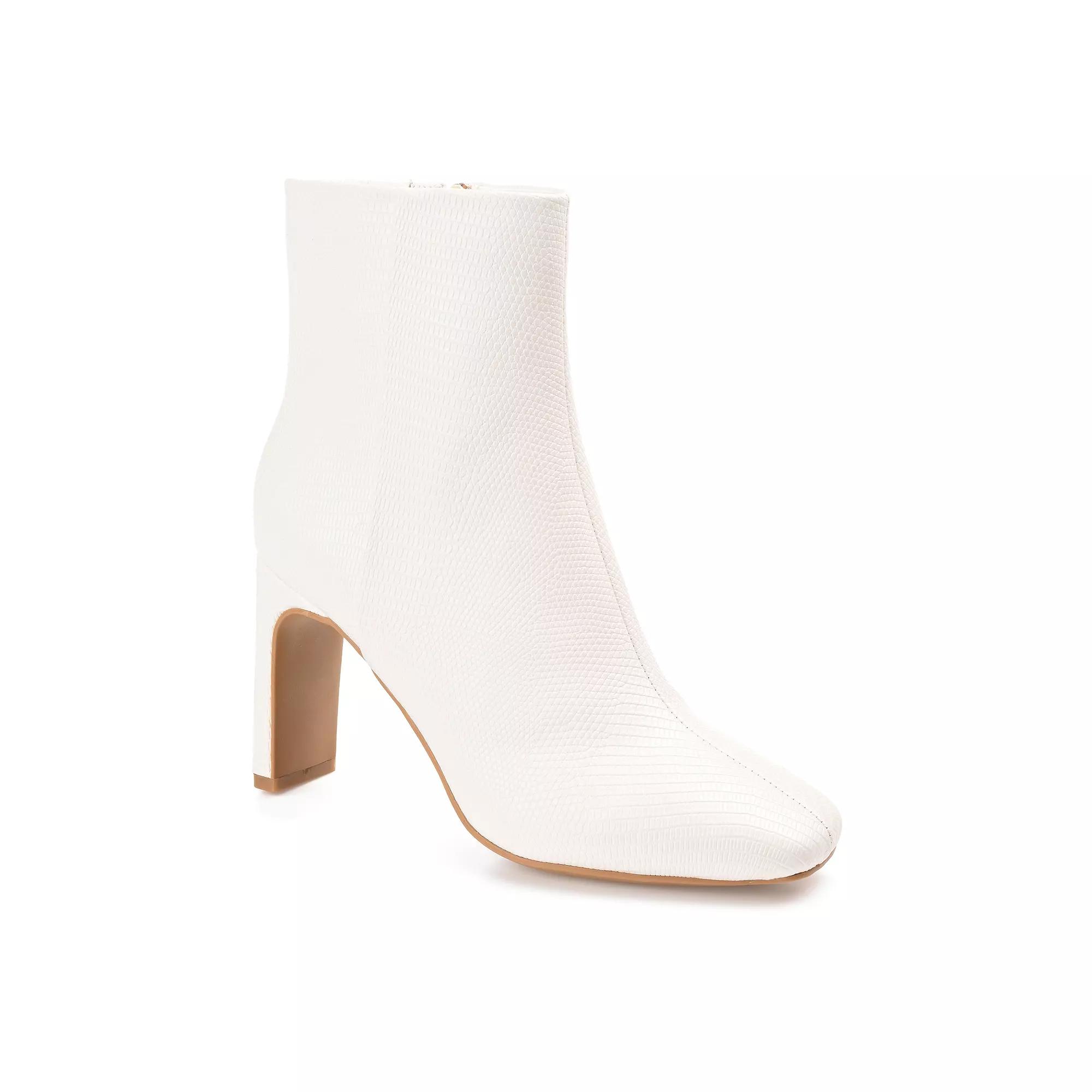 Super cute and super versatile, the Sarla by Journee Collection. These square-toe booties feature lizard textured vegan leather uppers detailed with a retro center seam. A 4 mm true comfort foam insole makes them comfortable to walk in, and an inside zipper makes them easy to slip on.Features: ComfortClosure Type: ZipperFootwear Technology: Memory Foam InsoleShaft Circumference: 10 1/2 InchesBoot Shaft Height: 5 InchesShoe Heel Height: 3 1/2 InchesUpper/Outer Base Material: 100% PolyuretheneShoe Lining Material: FabricSole Material Content: 100% PolyurethaneCalf Width: RegularToe Type: Closed ToeHeel Style: Block HeelCountry of Origin: Imported