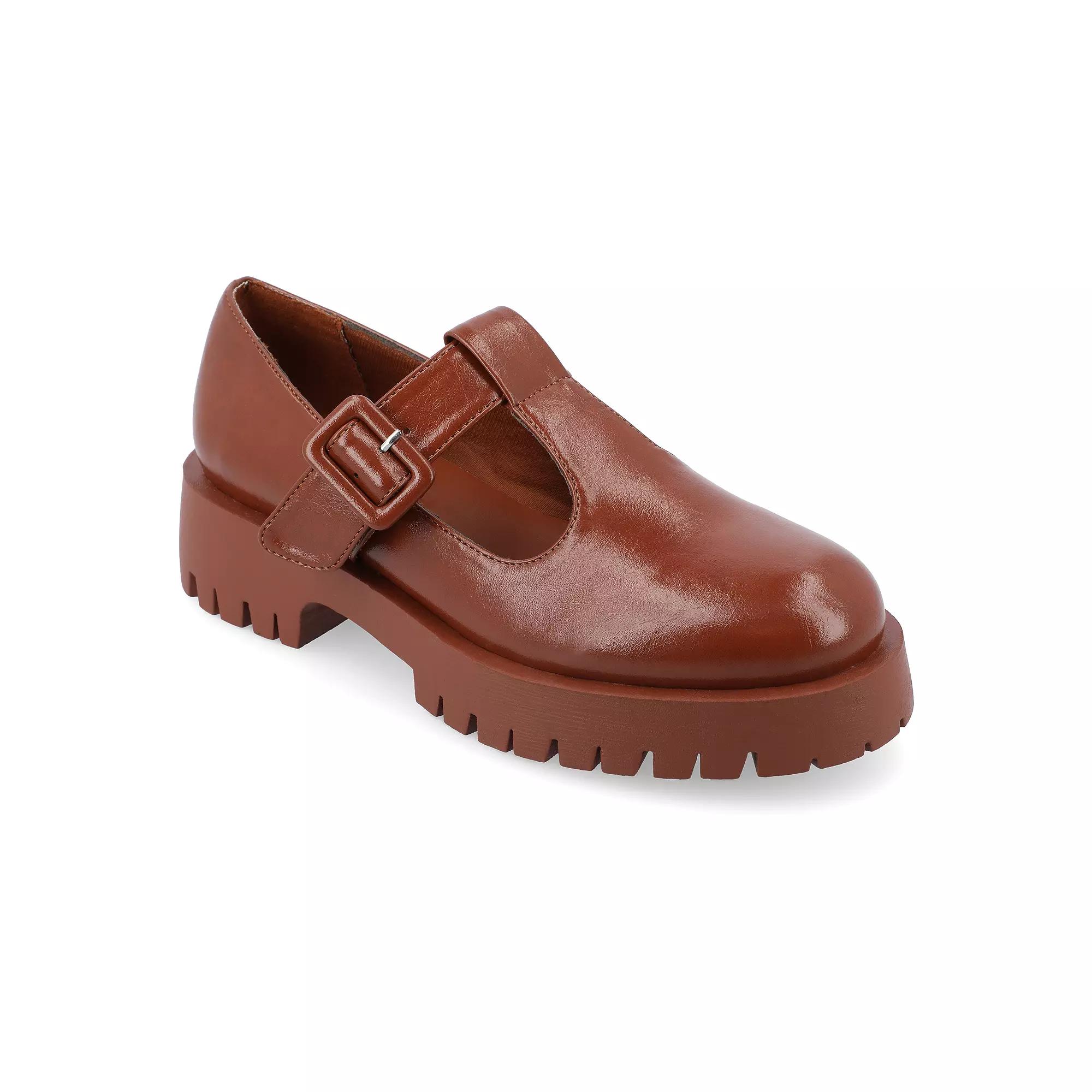 Step into style with these Journee Suvi women's mary jane flats. Click this FOOTWEAR GUIDE to find the perfect fit and more! - https://www.kohls.com/feature/shoesizeguide.jsp. FEATURES: footbed, Treaded outsole for traction. DETAILS: Faux leather upper, Fabric lining, Man-made outsole, Round toe, Buckle closure, footbed, 1.5-in. heel, 1-in. platform, Spot clean, Imported. Size: 8.5. Color: Cognac. Gender: female. Age Group: adult. Material: SYNTHETIC.