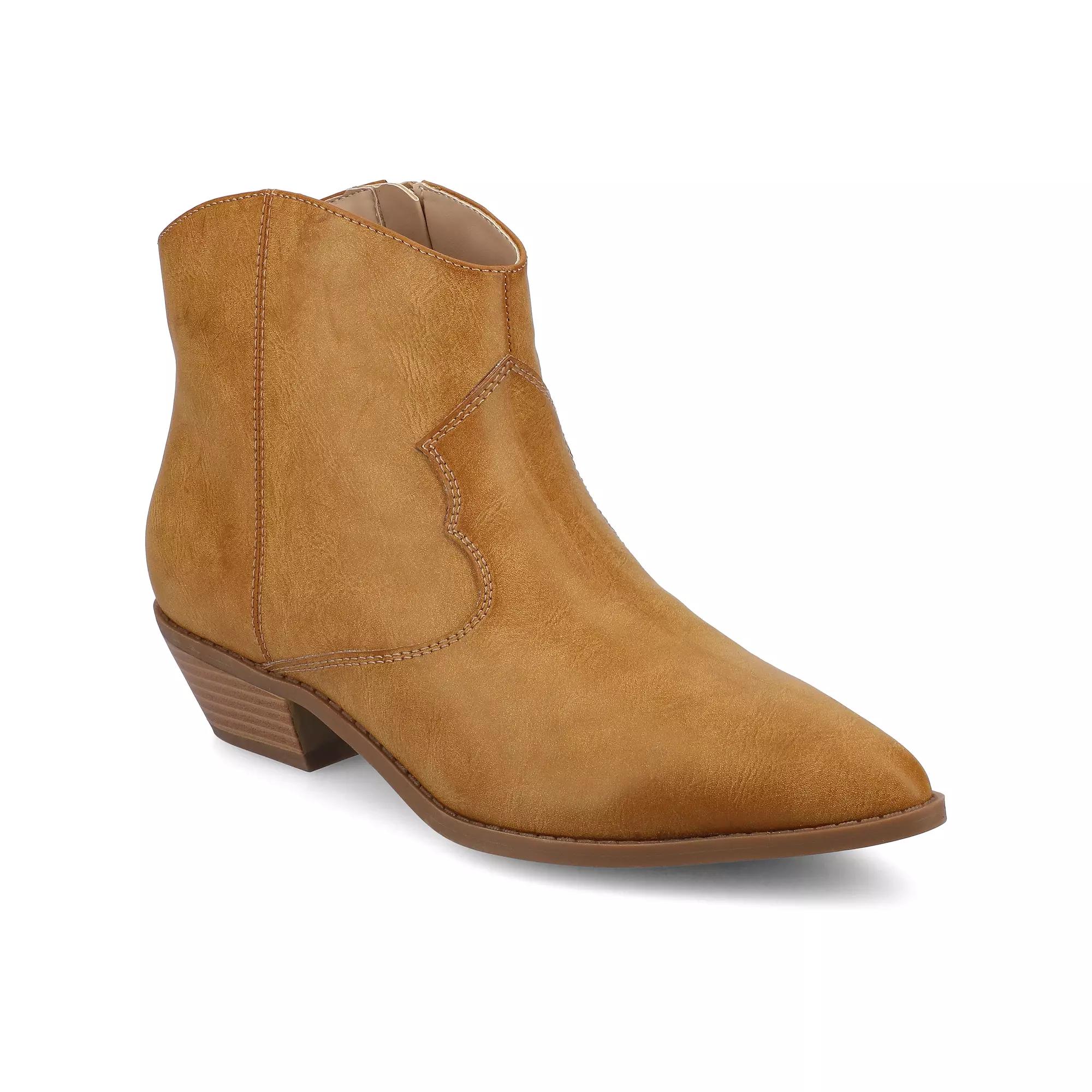 The Taliah western ankle bootie from Journee offers a sleek, pull-on design with smooth faux leather and unique stitching details for added flair and style. Featuring a 1 1/2-inch Cuban heel, 4-inch shaft height, and 10-inch top circumference, it’s both stylish and versatile. The signature 4 mm Journee Comfort System™ insole provides all-day comfort for any occasion. Crafted with exceptional quality and designed for an ideal fit, this style brings together trend-forward aesthetics and lasting comfort. Click this FOOTWEAR GUIDE to find the perfect fit and more! - https://www.kohls.com/feature/shoesizeguide.jsp. FEATURES: Journee comfort system Insole, Ankle height. DETAILS: Man-made upper, lining and midsole, Rubber outsole, Pointed toe, Pull-on, Foam footbed, Heel height: 1.5-in., Book shaft height: 4-in., Boot shaft circumference: 10-in., Spot clean, Imported. Size: 9.5 Wide. Gender: female. Age Group: adult. Material: SYNTHETIC.