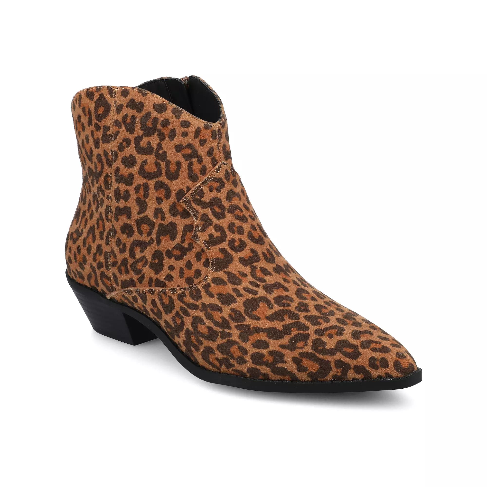 The Taliah western ankle bootie from Journee offers a sleek, pull-on design with smooth faux leather and unique stitching details for added flair and style. Featuring a 1 1/2-inch Cuban heel, 4-inch shaft height, and 10-inch top circumference, it’s both stylish and versatile. The signature 4 mm Journee Comfort System™ insole provides all-day comfort for any occasion. Crafted with exceptional quality and designed for an ideal fit, this style brings together trend-forward aesthetics and lasting comfort. Click this FOOTWEAR GUIDE to find the perfect fit and more! - https://www.kohls.com/feature/shoesizeguide.jsp. FEATURES: Journee comfort system Insole, Ankle height. DETAILS: Man-made upper, lining and midsole, Rubber outsole, Pointed toe, Pull-on, Foam footbed, Heel height: 1.5-in., Book shaft height: 4-in., Boot shaft circumference: 10-in., Spot clean, Imported. Size: 9. Color: Leopard Camel. Gender: female. Age Group: adult. Material: SYNTHETIC.