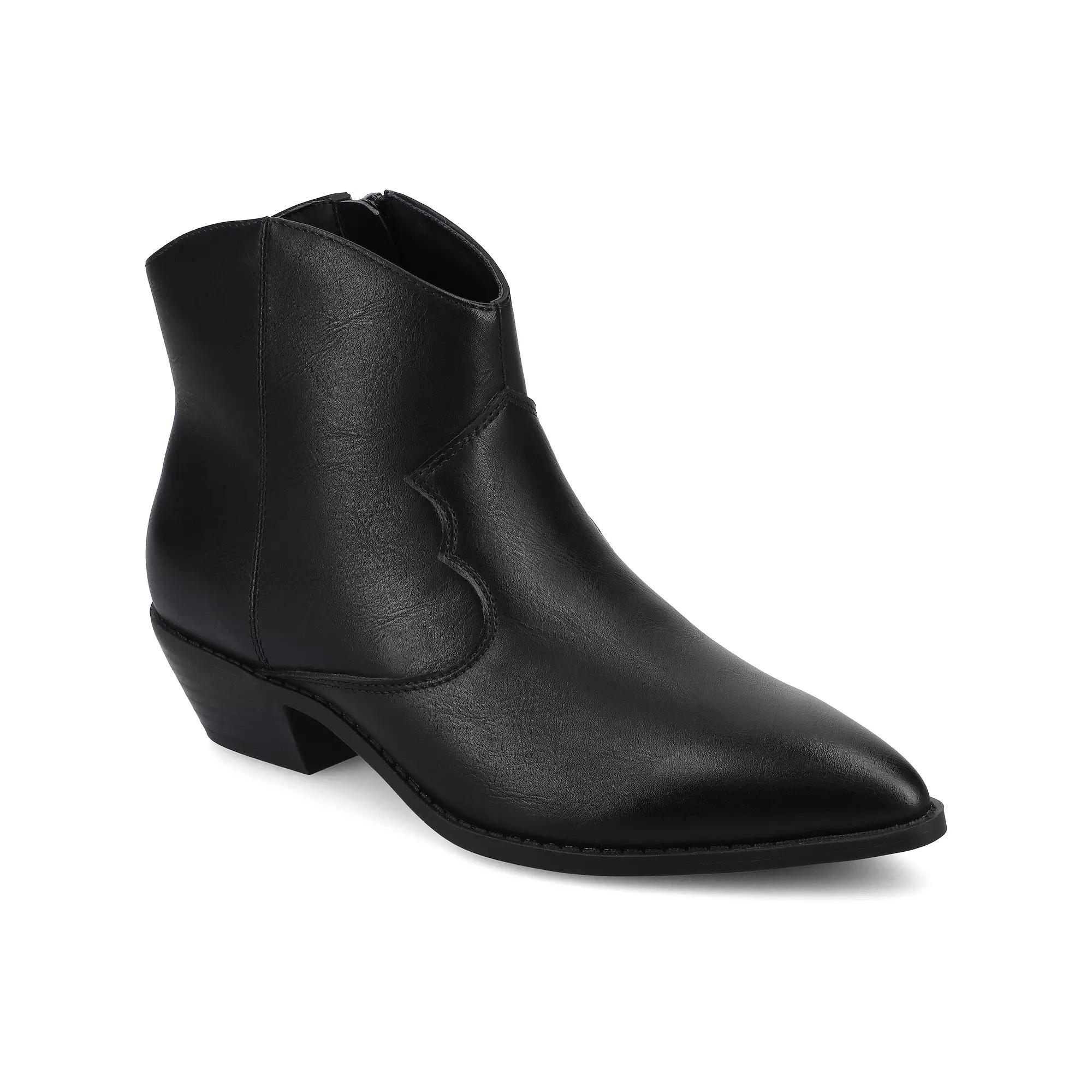 The Taliah western ankle bootie from Journee offers a sleek, pull-on design with smooth faux leather and unique stitching details for added flair and style. Featuring a 1 1/2-inch Cuban heel, 4-inch shaft height, and 10-inch top circumference, it’s both stylish and versatile. The signature 4 mm Journee Comfort System™ insole provides all-day comfort for any occasion. Crafted with exceptional quality and designed for an ideal fit, this style brings together trend-forward aesthetics and lasting comfort. Click this FOOTWEAR GUIDE to find the perfect fit and more! - https://www.kohls.com/feature/shoesizeguide.jsp. FEATURES: Journee comfort system Insole, Ankle height. DETAILS: Man-made upper, lining and midsole, Rubber outsole, Pointed toe, Pull-on, Foam footbed, Heel height: 1.5-in., Book shaft height: 4-in., Boot shaft circumference: 10-in., Spot clean, Imported. Size: 9. Color: Black. Gender: female. Age Group: adult. Material: SYNTHETIC.