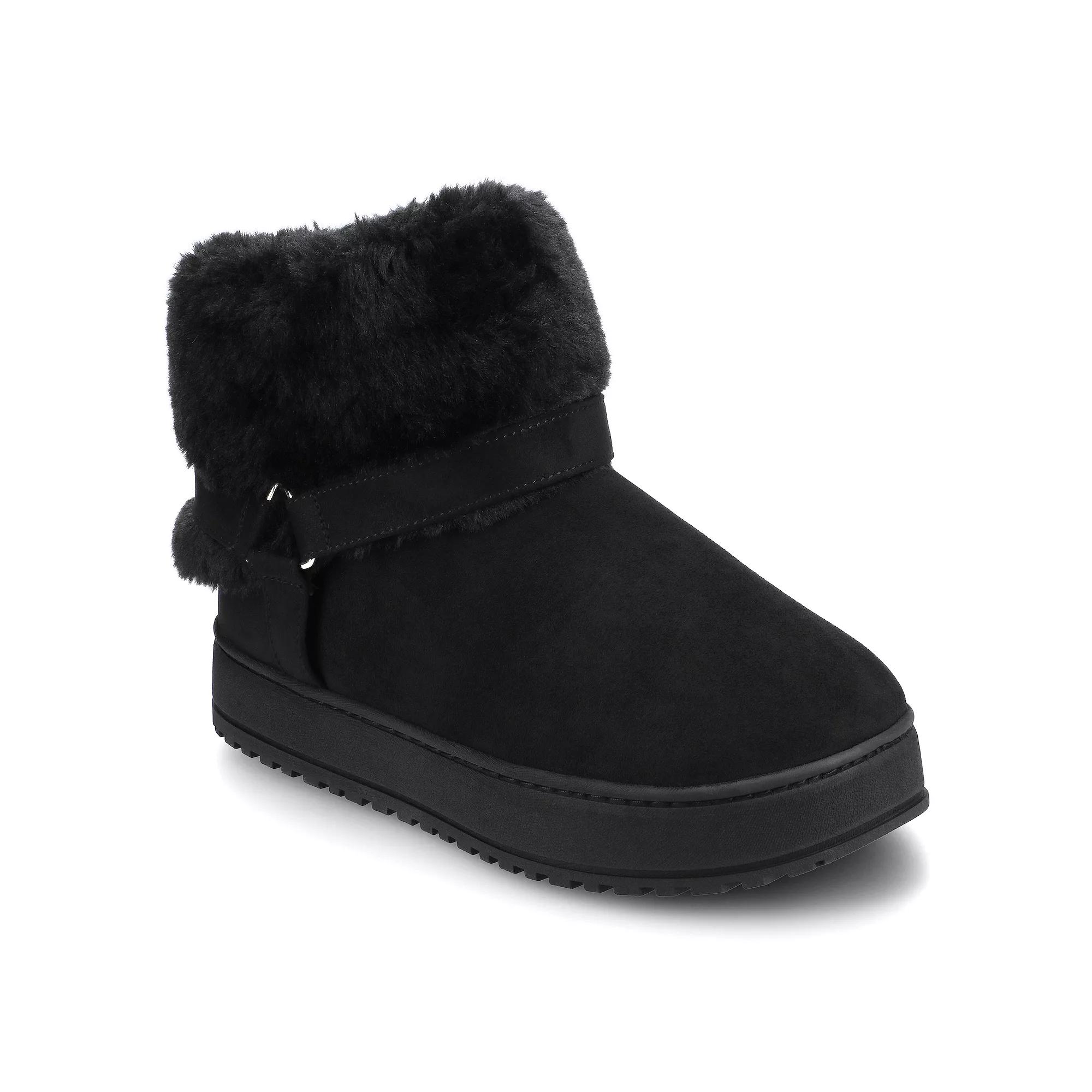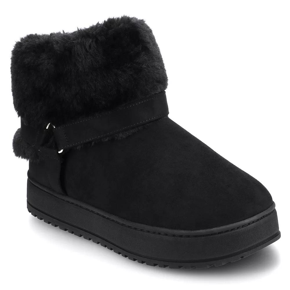 Wrap your feet in the ultimate comfort with these delightful slipper booties from Journee. Featuring a warm Sherpa lining and a plush upper, they invite you to unwind and savor cozy moments at home, making every day feel like a special occasion. Click this FOOTWEAR GUIDE to find the perfect fit and more! - https://www.kohls.com/feature/shoesizeguide.jsp. FEATURES: Journee Comfort System Insole for enhanced support, Warm Sherpa Lining for cozy comfort, Plush Upper Material for a soft feel. DETAILS: Round toe, Pull-on closure, Flex groove outsole, Platform height: 1.5", Imported. MATERIAL & CARE: Man-made upper, lining, and midsole, Foam footbed, Rubber outsole, Spot clean. Size: M(7/8). Color: Black. Gender: female. Age Group: adult. Material: SYNTHETIC.