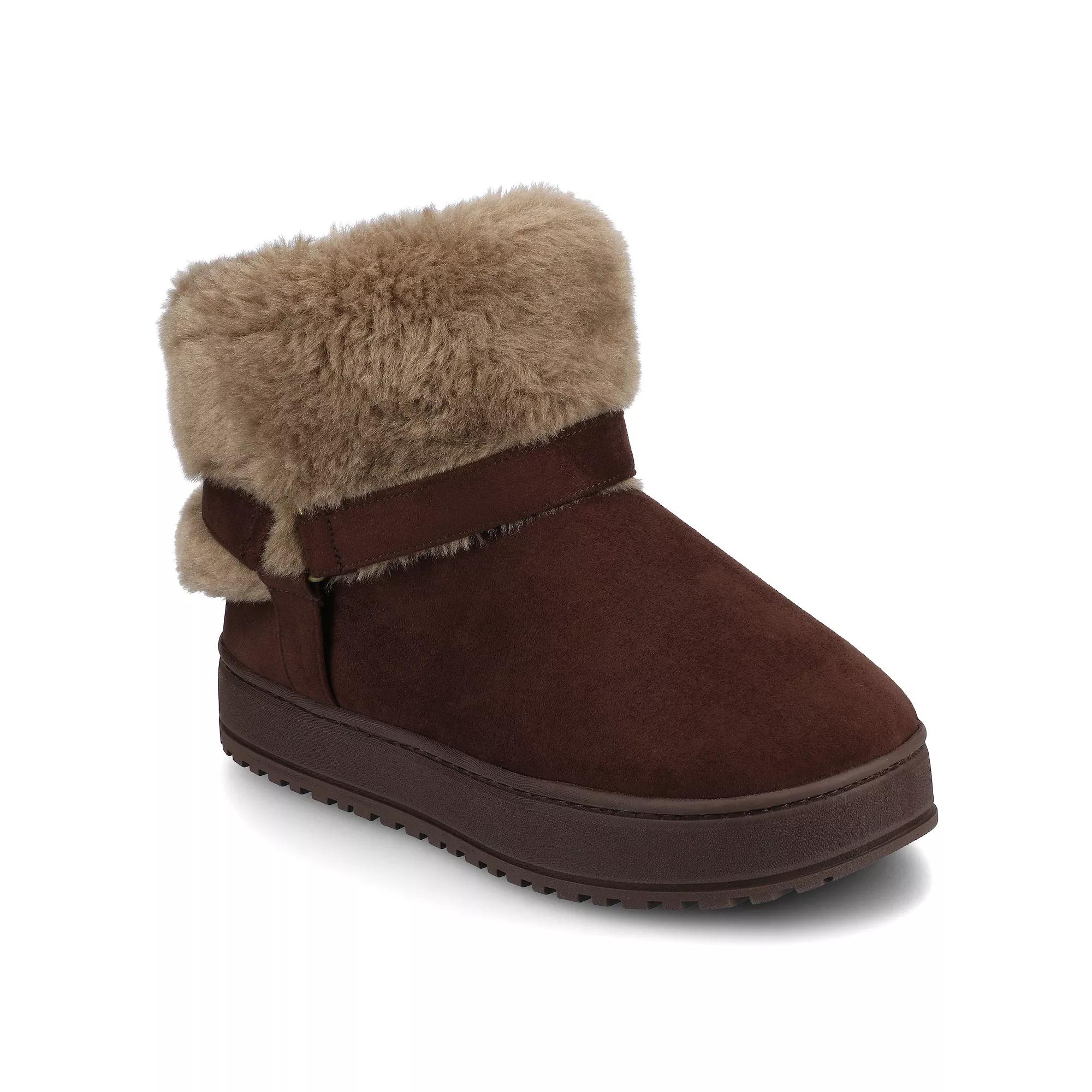 Wrap your feet in the ultimate comfort with these delightful slipper booties from Journee. Featuring a warm Sherpa lining and a plush upper, they invite you to unwind and savor cozy moments at home, making every day feel like a special occasion. Click this FOOTWEAR GUIDE to find the perfect fit and more! - https://www.kohls.com/feature/shoesizeguide.jsp. FEATURES: Journee Comfort System Insole for enhanced support, Warm Sherpa Lining for cozy comfort, Plush Upper Material for a soft feel. DETAILS: Round toe, Pull-on closure, Flex groove outsole, Platform height: 1.5", Imported. MATERIAL & CARE: Man-made upper, lining, and midsole, Foam footbed, Rubber outsole, Spot clean. Size: M(7/8). Color: Chocolate. Gender: female. Age Group: adult. Material: SYNTHETIC.
