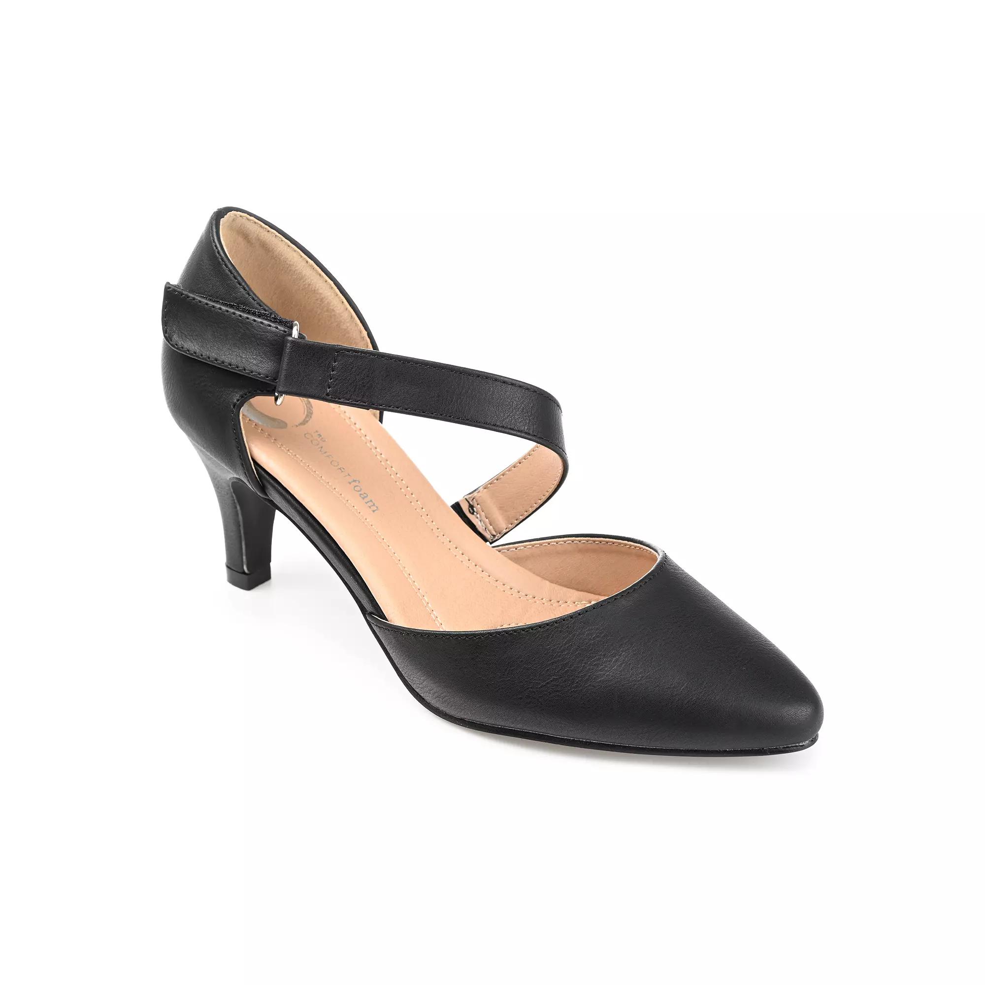 Show off the classic pump with a twist in pointed-toe pumps by Journee Collection. These pumps are made with premium faux leather and highlight an asymmetrical strap across the D'Orsay style. Small stiletto heels, a comfort insole, and pointed toes complete the style.Features: ComfortClosure Type: BuckleFootwear Technology: Memory Foam InsoleShoe Heel Height: 2 1/2 InchesUpper/Outer Base Material: 100% PolyuretheneShoe Lining Material: PolyurethaneSole Material Content: 100% PolyurethaneToe Type: Pointed ToeShoe Strap Type: Adjustable StrapCare: Spot CleanHeel Style: Flat HeelCountry of Origin: Imported