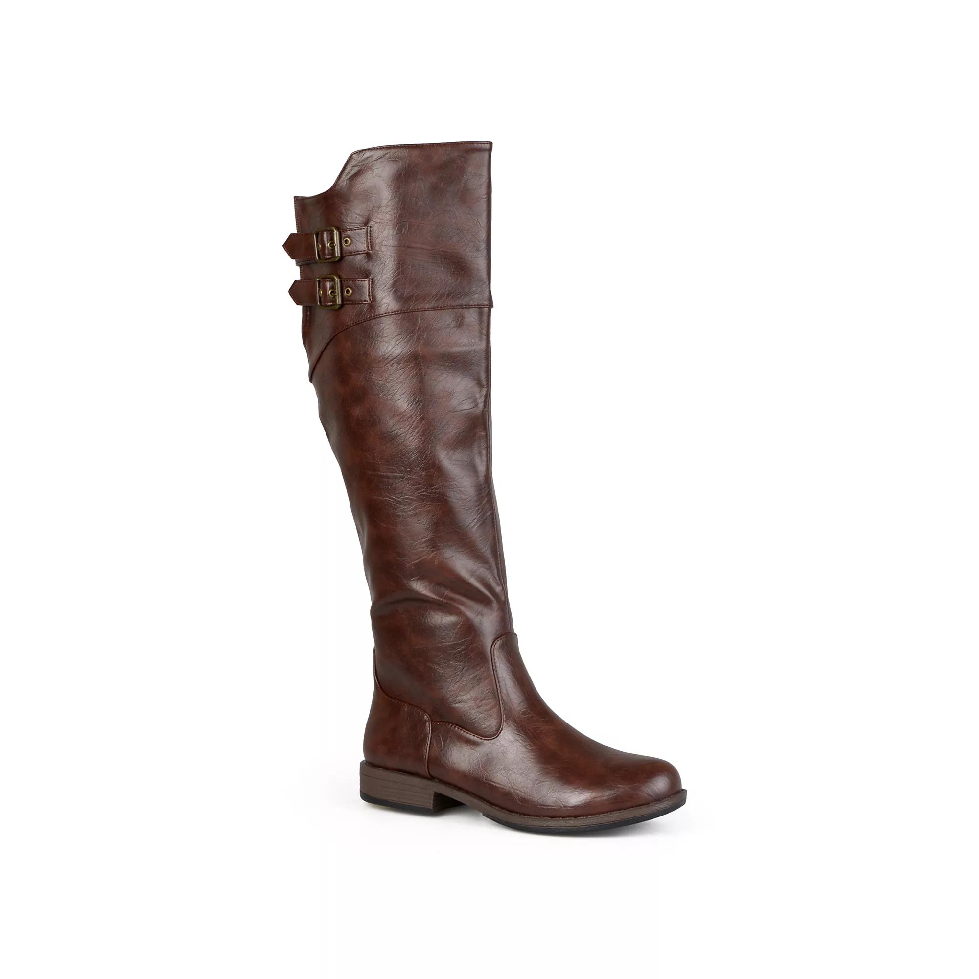 Add urban chic footwear to your wardrobe with these women's Tori boots by Journee. WC = Medium Width, Wide Calf. Click this FOOTWEAR GUIDE to find the perfect fit and more! - https://www.kohls.com/feature/shoesizeguide.jsp. M XWC = Medium Width, Extra Wide Calf. W = Wide Width, Regular Calf. W WC = Wide Width, Wide Calf. W XWC = Wide Width, Extra Wide Calf. Watch the video to find out how to perfectly fit your boots. - https://media.kohlsimg.com/is/content/kohls/mp4/1708/KOHLSBootFitGuide_VDEO.mp4. BOOT FEATURES: High front shaft. Double-buckle details. BOOT CONSTRUCTION: Manmade upper. Fabric lining. TPR outsole. BOOT DETAILS: Round toe. Zipper closure. Padded footbed. 1-in. heel. 18-in. shaft. 16-in. circumference. 18-in. WC circumference. 19-in. XWC circumference. Size: 8.5 W XWc. Color: Brown. Gender: female. Age Group: kids. Pattern: Solid. Material: LEATHER.
