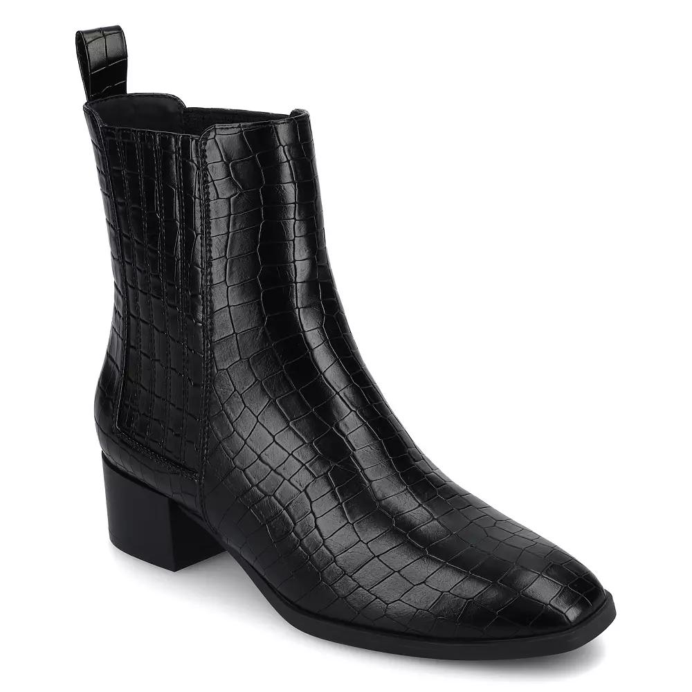 These Journee Wrenley Women's Booties are so comfortable and stylish, they're sure to be your new favorite pair. Click this FOOTWEAR GUIDE to find the perfect fit and more! - https://www.kohls.com/feature/shoesizeguide.jsp. FEATURES: Ankle height, for all day comfort, Stacked block heel adds stability, Side gore stretch. DETAILS: Faux leather upper and midsole, Fabric lining, Man-made outsole, Square toe, footbed, 1-in. heel height, Shaft height: 6-in., Shaft circumference: 10-in., Spot clean, Imported. Size: 6.5 Wide. Color: Black Croco. Gender: female. Age Group: adult. Material: SYNTHETIC.