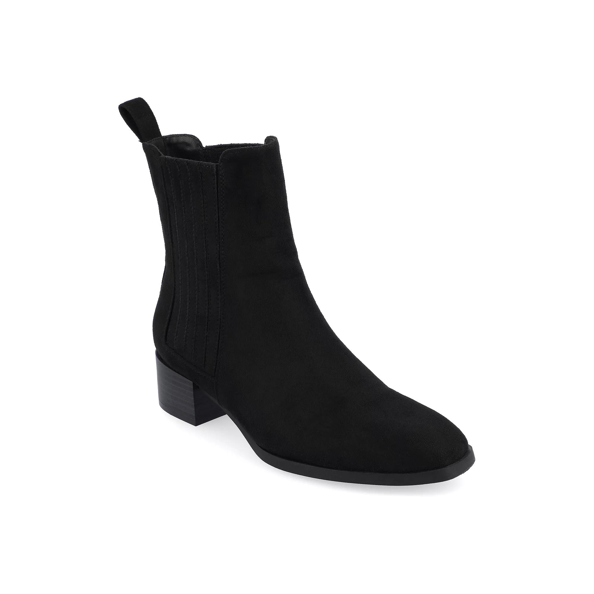 These Journee Wrenley Women's Booties are so comfortable and stylish, they're sure to be your new favorite pair. Click this FOOTWEAR GUIDE to find the perfect fit and more! - https://www.kohls.com/feature/shoesizeguide.jsp. FEATURES: Ankle height, for all day comfort, Stacked block heel adds stability, Side gore stretch. DETAILS: Faux leather upper and midsole, Fabric lining, Man-made outsole, Square toe, footbed, 1-in. heel height, Shaft height: 6-in., Shaft circumference: 10-in., Spot clean, Imported. Size: 9.5 Wide. Color: Black. Gender: female. Age Group: adult. Material: SYNTHETIC.