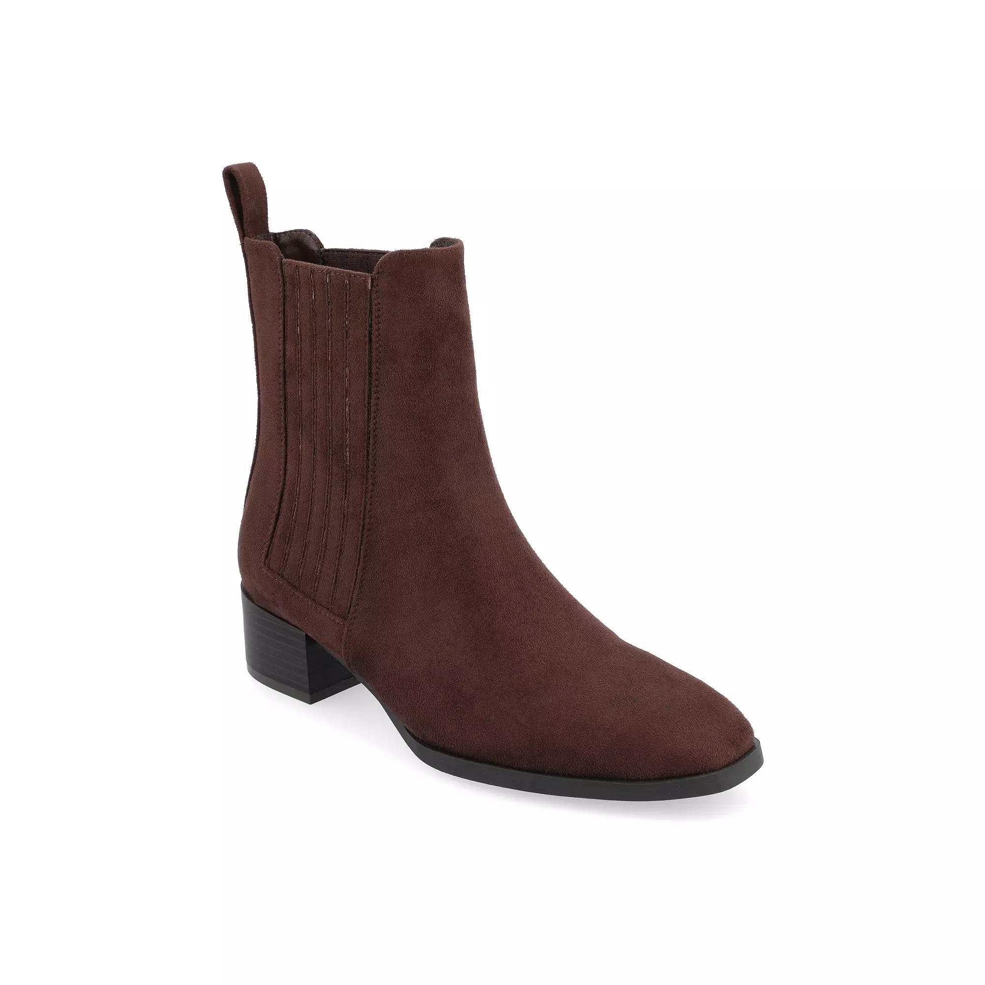These Journee Wrenley Women's Booties are so comfortable and stylish, they're sure to be your new favorite pair. Click this FOOTWEAR GUIDE to find the perfect fit and more! - https://www.kohls.com/feature/shoesizeguide.jsp. FEATURES: Ankle height, for all day comfort, Stacked block heel adds stability, Side gore stretch. DETAILS: Faux leather upper and midsole, Fabric lining, Man-made outsole, Square toe, footbed, 1-in. heel height, Shaft height: 6-in., Shaft circumference: 10-in., Spot clean, Imported. Size: 7 Wide. Color: Brown. Gender: female. Age Group: adult. Material: SYNTHETIC.