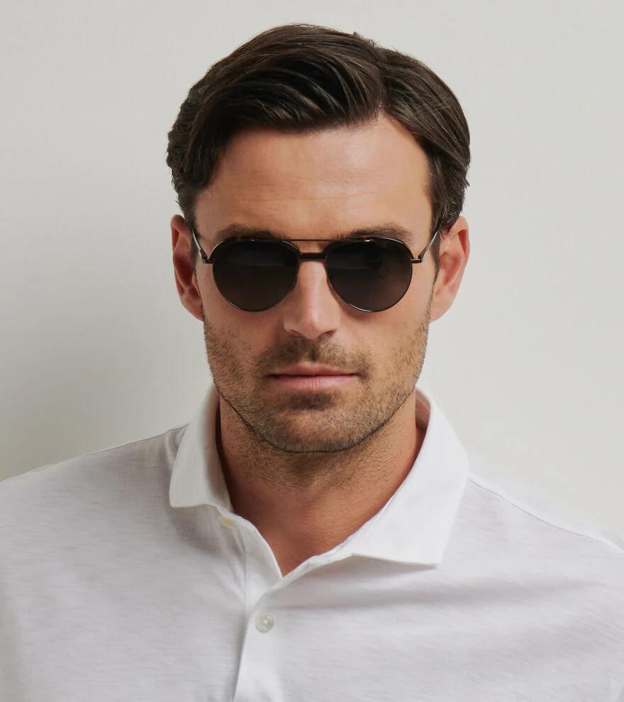 The Aviator-inspired style is recognized for signature teardrop lenses designed to accommodate pilots looking down at their instrument panel in flight. We’ve reimagined the classic design with acetate accents, dark titanium arms and strategically shaped nose pieces. Crafted by artisans in Italy, they feature polarized sapphire crystal lenses that are scratch and shatter-resistant with UV 400 protection. Includes a pebble grain leather case and lens cleaner.